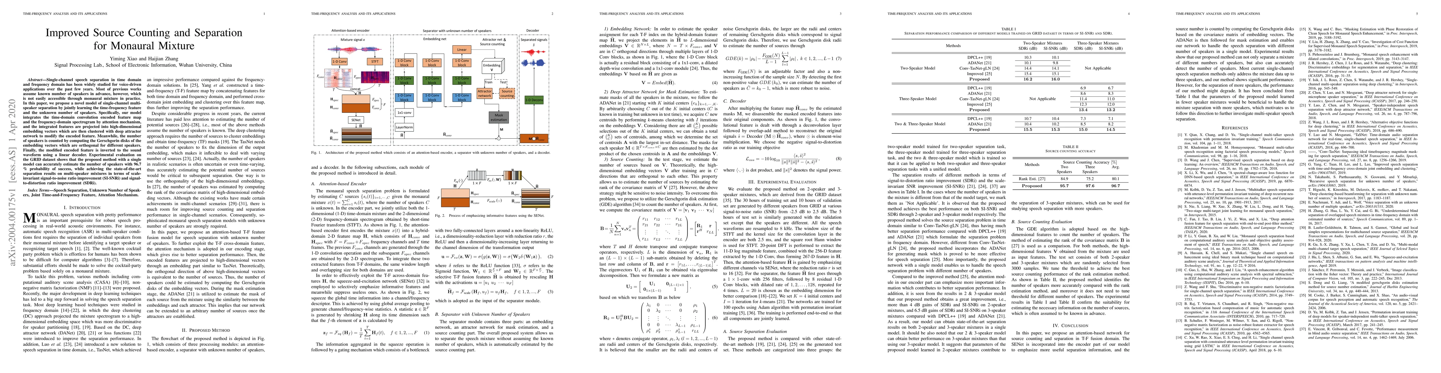 Single-channel speech separation in time domain and frequency domain has been widely studied for voice-driven applications over the past few years. Most of previous works assume known number of speakers in advance, however, which is not easily accessible through monaural mixture in practice. In this paper, we propose a novel model of single-channel multi-speaker separation by jointly learning the time-frequency feature and the unknown number of speakers. Specifically, our model integrates the time-domain convolution encoded feature map and the frequency-domain spectrogram by attention mechanism, and the integrated features are projected into high-dimensional embedding vectors which are then clustered with deep attractor network to modify the encoded feature. Meanwhile, the number of speakers is counted by computing the Gerschgorin disks of the embedding vectors which are orthogonal for different speakers. Finally, the modified encoded feature is inverted to the sound waveform using a linear decoder. Experimental evaluation on the GRID dataset shows that the proposed method with a single model can accurately estimate the number of speakers with 96.7 % probability of success, while achieving the state-of-the-art separation results on multi-speaker mixtures in terms of scale-invariant signal-to-noise ratio improvement (SI-SNRi) and signal-to-distortion ratio improvement (SDRi).