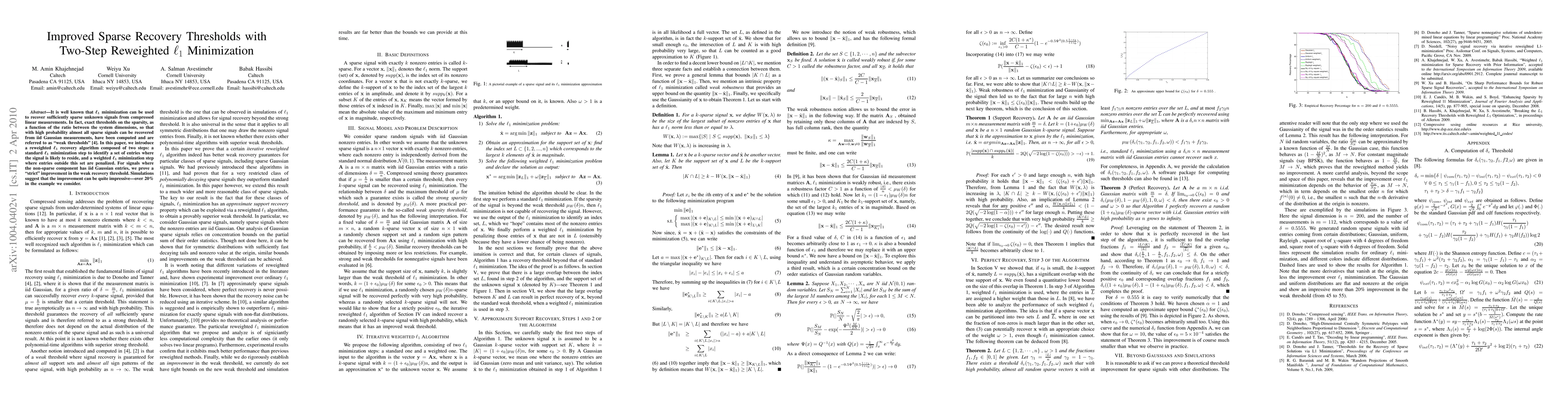 It is well known that $\ell_1$ minimization can be used to recover sufficiently sparse unknown signals from compressed linear measurements. In fact, exact thresholds on the sparsity, as a function of the ratio between the system dimensions, so that with high probability almost all sparse signals can be recovered from iid Gaussian measurements, have been computed and are referred to as "weak thresholds" \cite{D}. In this paper, we introduce a reweighted $\ell_1$ recovery algorithm composed of two steps: a standard $\ell_1$ minimization step to identify a set of entries where the signal is likely to reside, and a weighted $\ell_1$ minimization step where entries outside this set are penalized. For signals where the non-sparse component has iid Gaussian entries, we prove a "strict" improvement in the weak recovery threshold. Simulations suggest that the improvement can be quite impressive-over 20% in the example we consider.