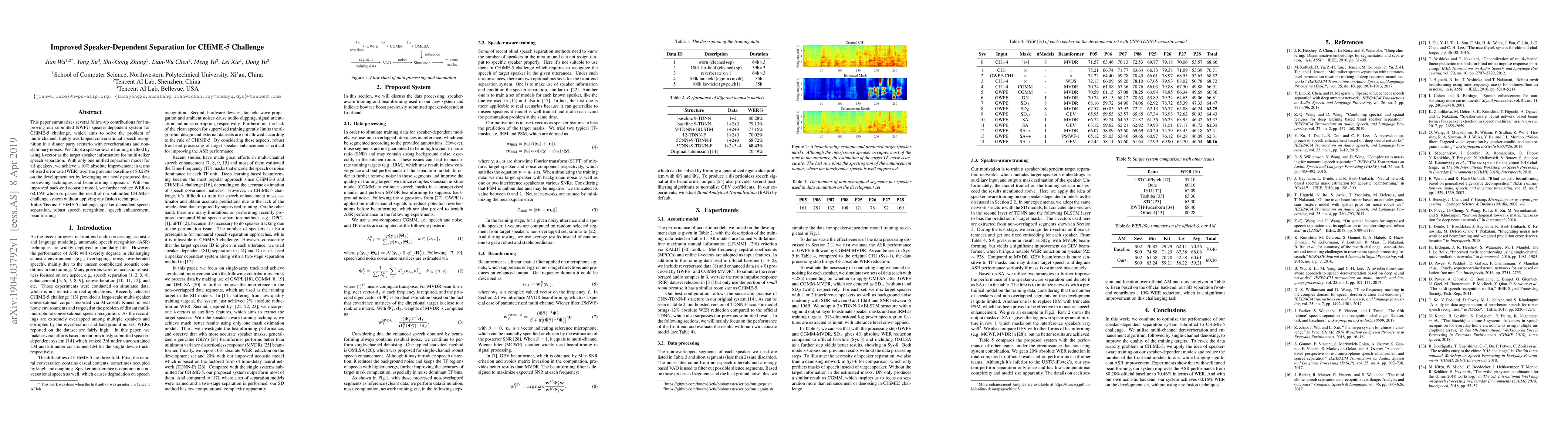 This paper summarizes several follow-up contributions for improving our submitted NWPU speaker-dependent system for CHiME-5 challenge, which aims to solve the problem of multi-channel, highly-overlapped conversational speech recognition in a dinner party scenario with reverberations and non-stationary noises. We adopt a speaker-aware training method by using i-vector as the target speaker information for multi-talker speech separation. With only one unified separation model for all speakers, we achieve a 10\% absolute improvement in terms of word error rate (WER) over the previous baseline of 80.28\% on the development set by leveraging our newly proposed data processing techniques and beamforming approach. With our improved back-end acoustic model, we further reduce WER to 60.15\% which surpasses the result of our submitted CHiME-5 challenge system without applying any fusion techniques.