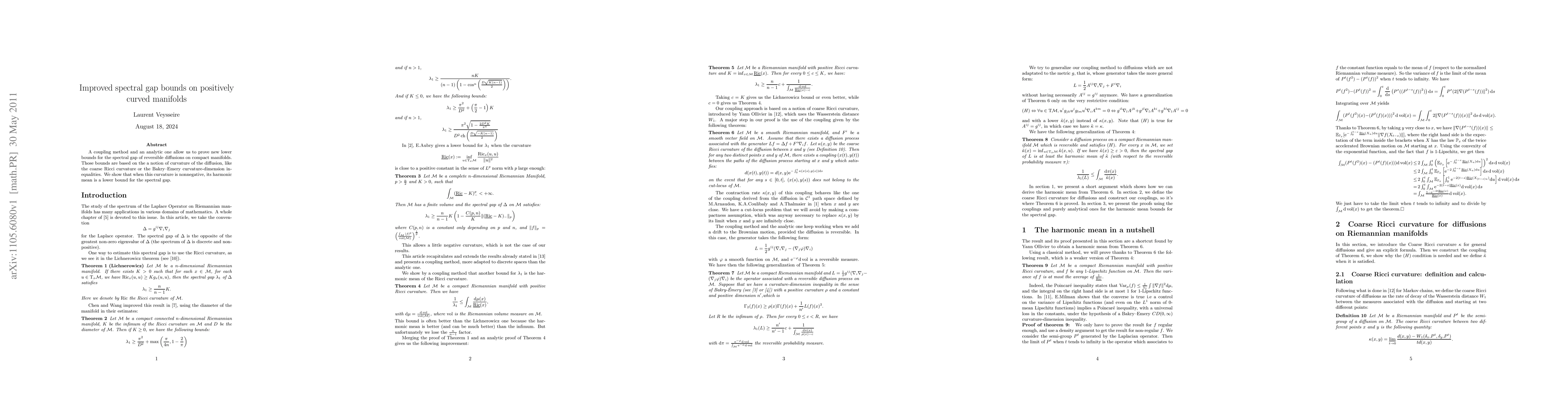 Improved bounds for the spectral gap have potential applications in understanding diffusion processes on manifolds