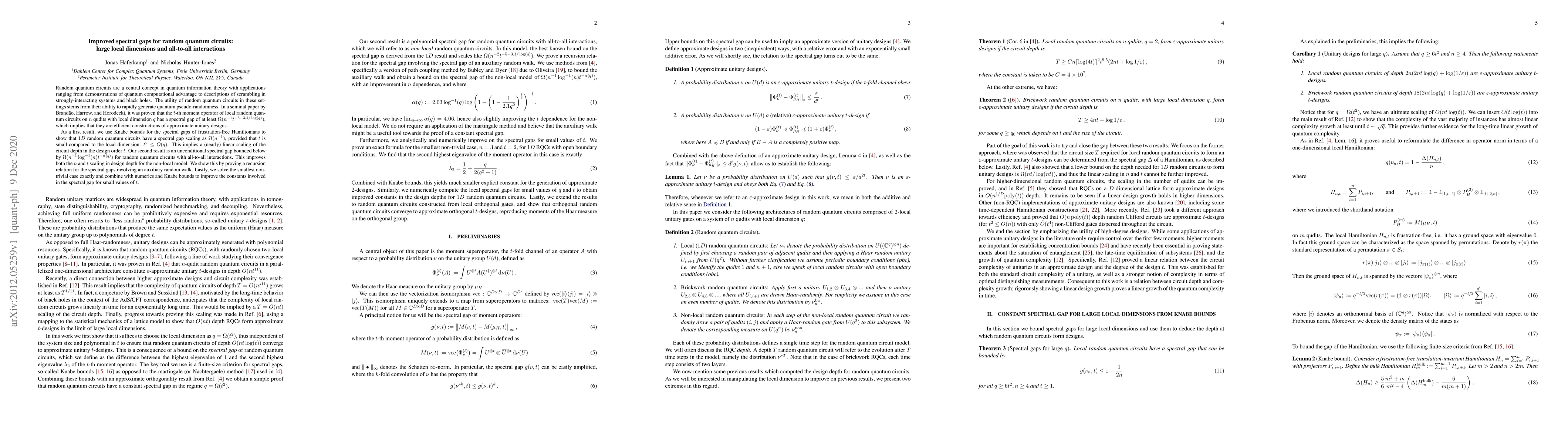 Random quantum circuits have improved spectral gaps for efficient approximate unitary designs, with nearly linear scaling of circuit depth in design order t and unconditional spectral gap improvements for non-local models.