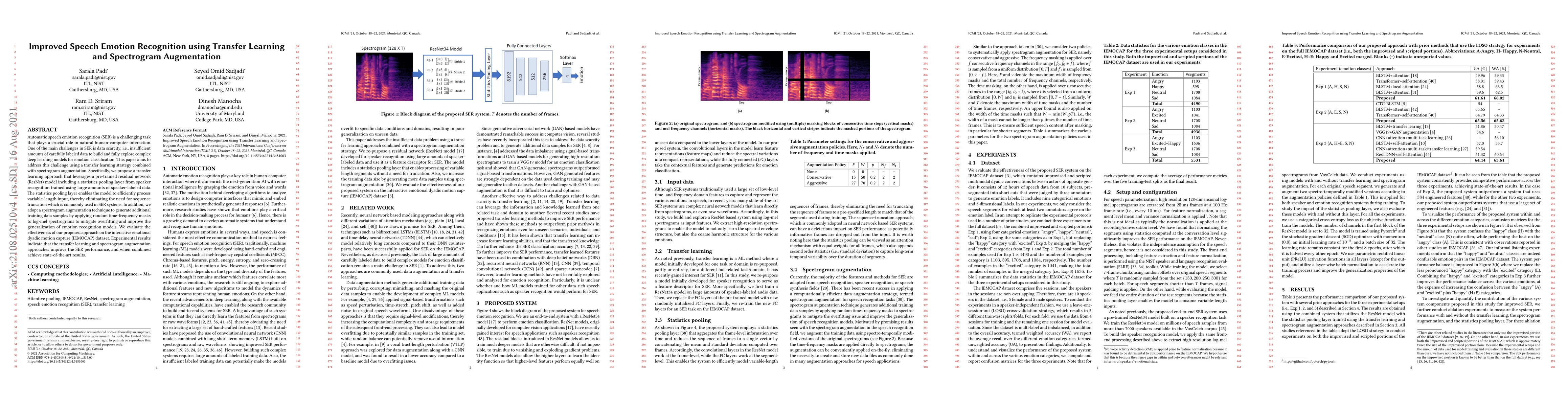 This paper proposes a transfer learning approach using a pre-trained ResNet model and spectrogram augmentation to tackle data scarcity in speech emotion recognition (SER). The results on the IEMOCAP dataset show significant improvements in SER performance, achieving state-of-the-art results.