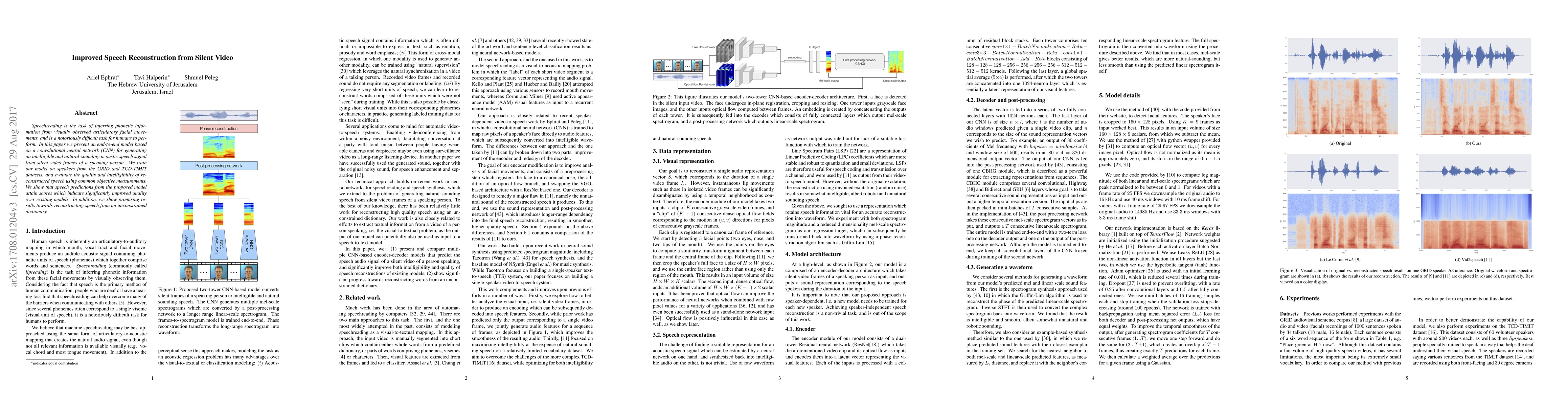 This paper presents a CNN-based model for reconstructing intelligible speech from silent video frames, significantly improving upon existing models in quality and intelligibility, as demonstrated by evaluations on GRID and TCD-TIMIT datasets. The model also shows promising results in reconstructing speech from an unconstrained dictionary.