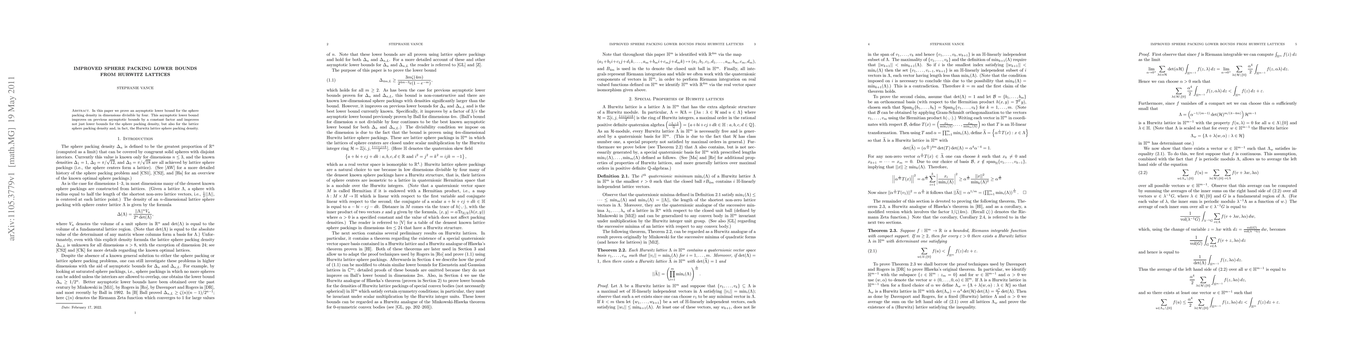 In this paper we prove an asymptotic lower bound for the sphere packing density in dimensions divisible by four. This asymptotic lower bound improves on previous asymptotic bounds by a constant factor and improves not just lower bounds for the sphere packing density, but also for the lattice sphere packing density and, in fact, the Hurwitz lattice sphere packing density.