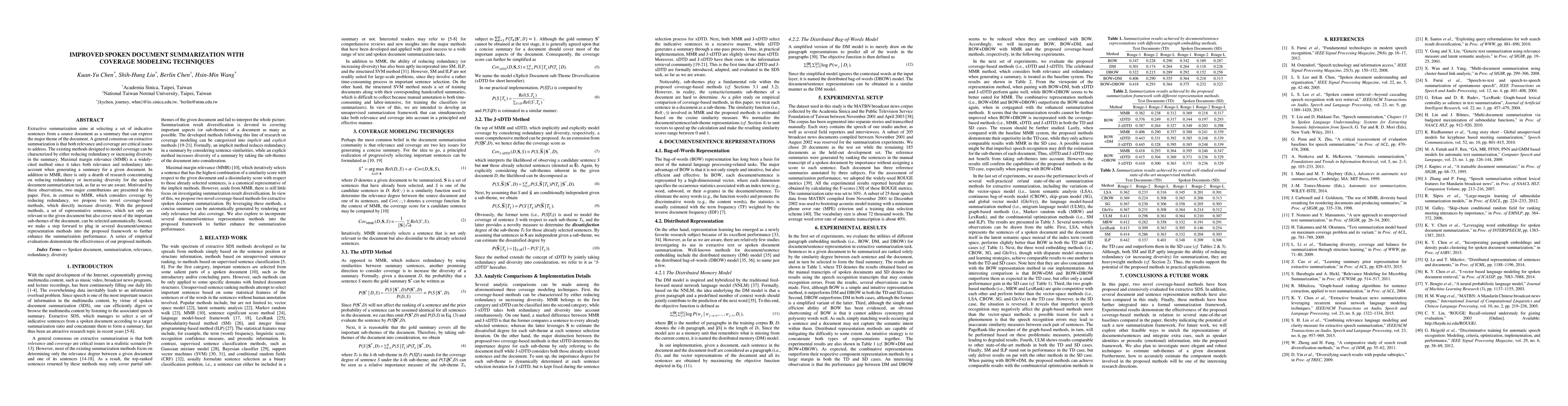 This paper proposes two novel coverage-based methods to improve spoken document summarization by directly increasing diversity, selecting representative sentences that cover important sub-themes. It also integrates various document/sentence representation techniques to enhance summarization performance, demonstrating effectiveness through empirical evaluations.