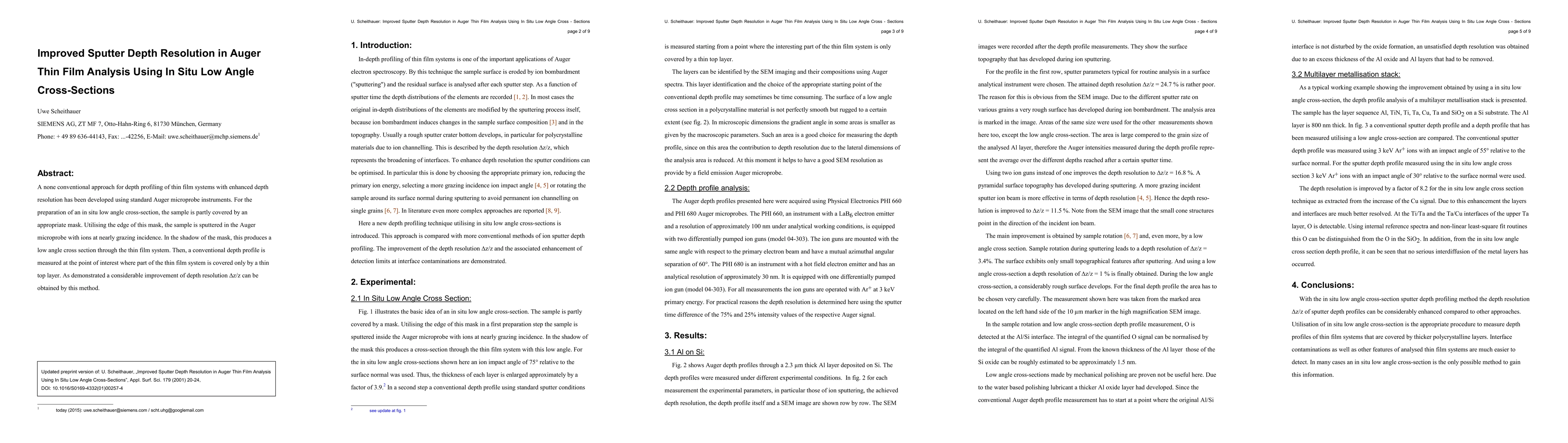 A none conventional approach for depth profiling of thin film systems with enhanced depth resolution has been developed using standard Auger microprobe instruments. For the preparation of an in situ low angle cross-section, the sample is partly covered by an appropriate mask. Utilising the edge of this mask, the sample is sputtered in the Auger microprobe with ions at nearly grazing incidence. In the shadow of the mask, this produces a low angle cross section through the thin film system. Then, a conventional depth profile is measured at the point of interest where part of the thin film system is covered only by a thin top layer. As demonstrated a considerable improvement of depth resolution delta z / z can be obtained by this method.