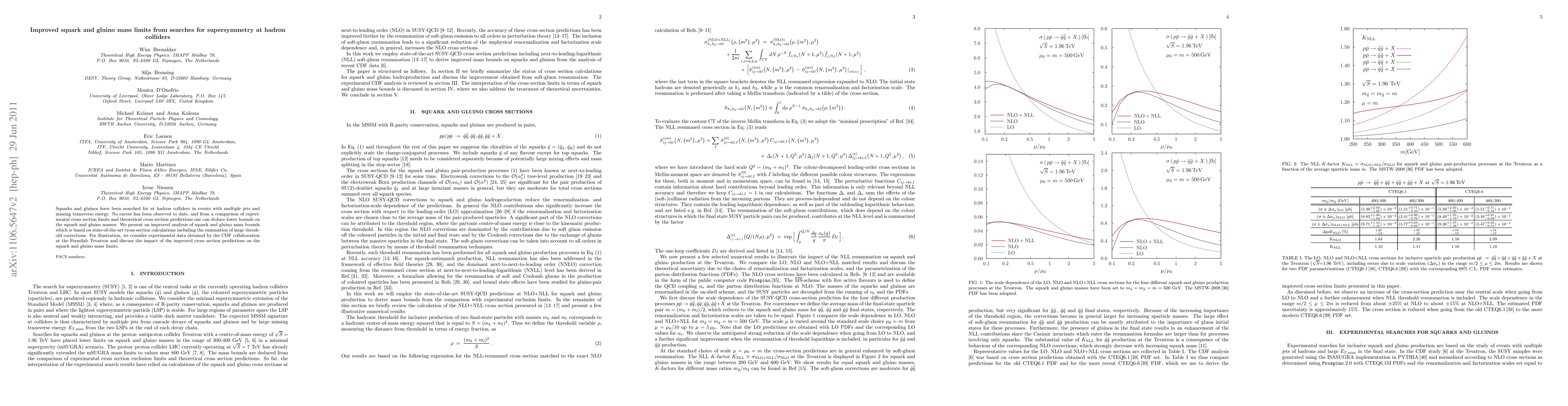 This paper presents enhanced limits on squark and gluino masses derived from hadron collider searches, utilizing advanced cross section calculations that incorporate significant threshold corrections. The improved analysis, exemplified by data from the CDF collaboration, provides tighter constraints on these supersymmetric particles.