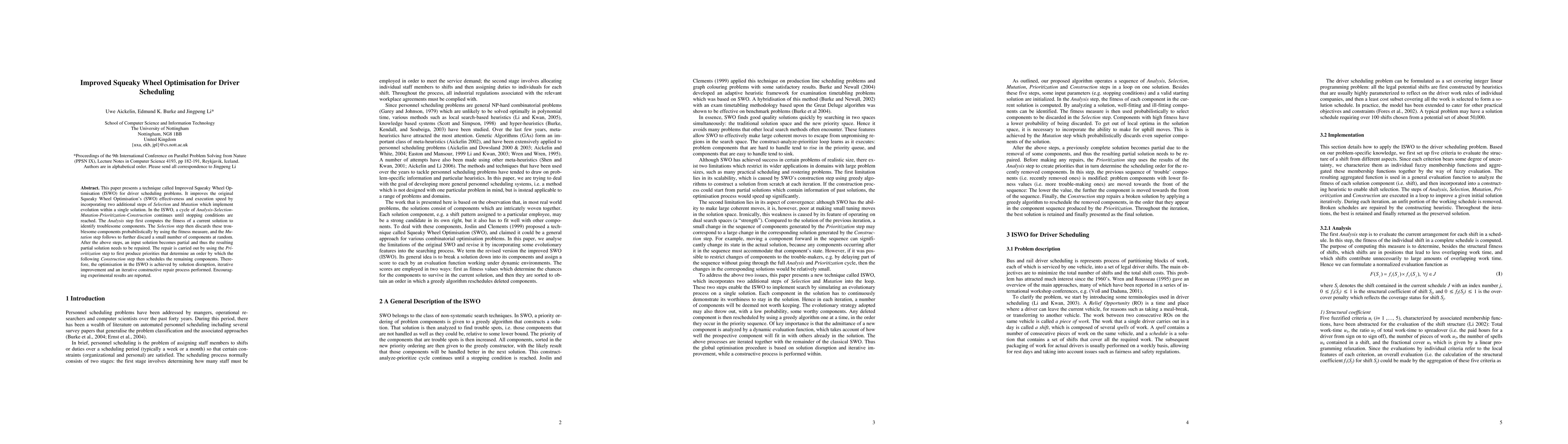 This paper presents a technique called Improved Squeaky Wheel Optimisation for driver scheduling problems. It improves the original Squeaky Wheel Optimisations effectiveness and execution speed by incorporating two additional steps of Selection and Mutation which implement evolution within a single solution. In the ISWO, a cycle of Analysis-Selection-Mutation-Prioritization-Construction continues until stopping conditions are reached. The Analysis step first computes the fitness of a current solution to identify troublesome components. The Selection step then discards these troublesome components probabilistically by using the fitness measure, and the Mutation step follows to further discard a small number of components at random. After the above steps, an input solution becomes partial and thus the resulting partial solution needs to be repaired. The repair is carried out by using the Prioritization step to first produce priorities that determine an order by which the following Construction step then schedules the remaining components. Therefore, the optimisation in the ISWO is achieved by solution disruption, iterative improvement and an iterative constructive repair process performed. Encouraging experimental results are reported.