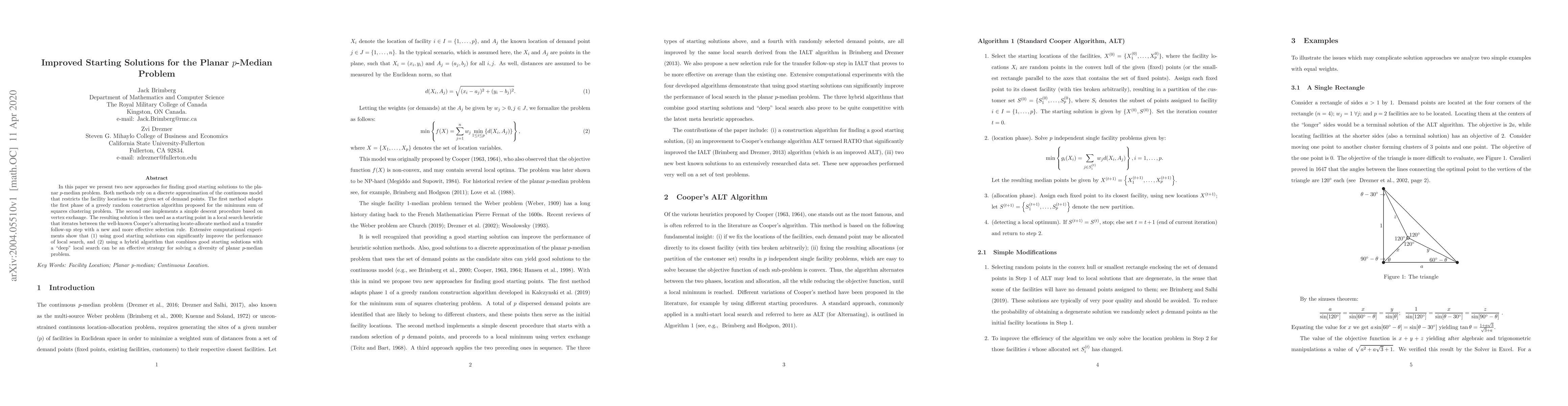 This paper introduces two new methods for finding improved starting solutions for the planar p-median problem, employing a discrete approximation and a hybrid local search approach. Both methods significantly enhance the performance of local search heuristics, demonstrating effective strategies for solving diverse instances of the problem.