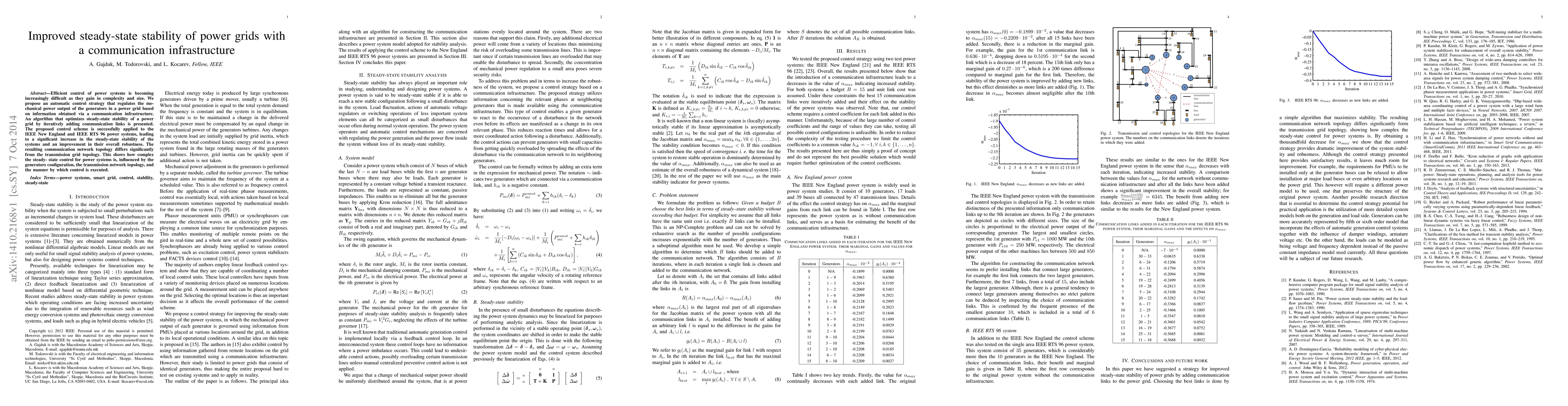 Efficient control of power systems is becoming increasingly difficult as they gain in complexity and size. We propose an automatic control strategy that regulates the mechanical power output of the generators in a power grid based on information obtained via a communication infrastructure. An algorithm that optimizes steady-state stability of a power grid by iteratively adding communication links is presented. The proposed control scheme is successfully applied to the IEEE New England and IEEE RTS 96 power systems, leading to a significant increase in the steady-state stability of the systems and an improvement in their overall robustness. The resulting communication network topology differs significantly from the transmission grid topology. This shows how complex the steady- state control for power systems is, influenced by the generators configuration, the transmission network topology, and the manner by which control is executed.