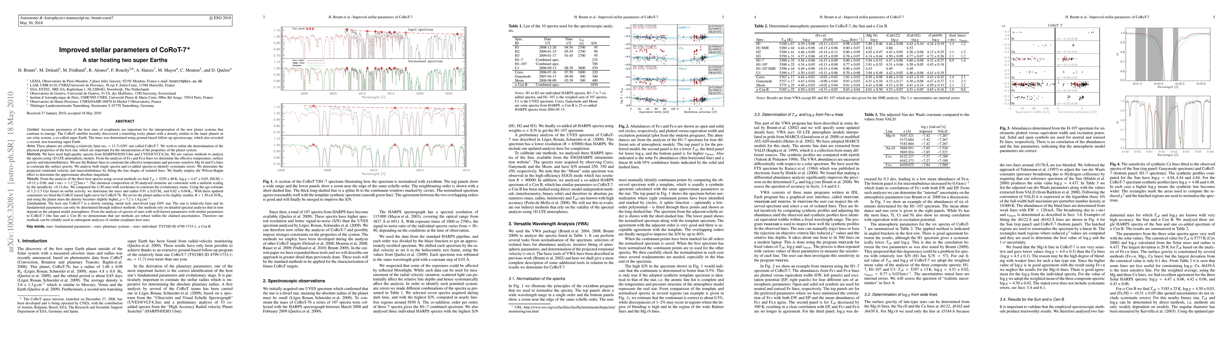This paper refines the stellar parameters of CoRoT-7, a G9V star hosting a Super Earth exoplanet, using high-resolution spectra from HARPS and UVES. The updated parameters include Teff, log g, and metallicity, leading to a revised mass and radius for the star, and a smaller, denser planet. The methods used are validated against stars with known parameters.