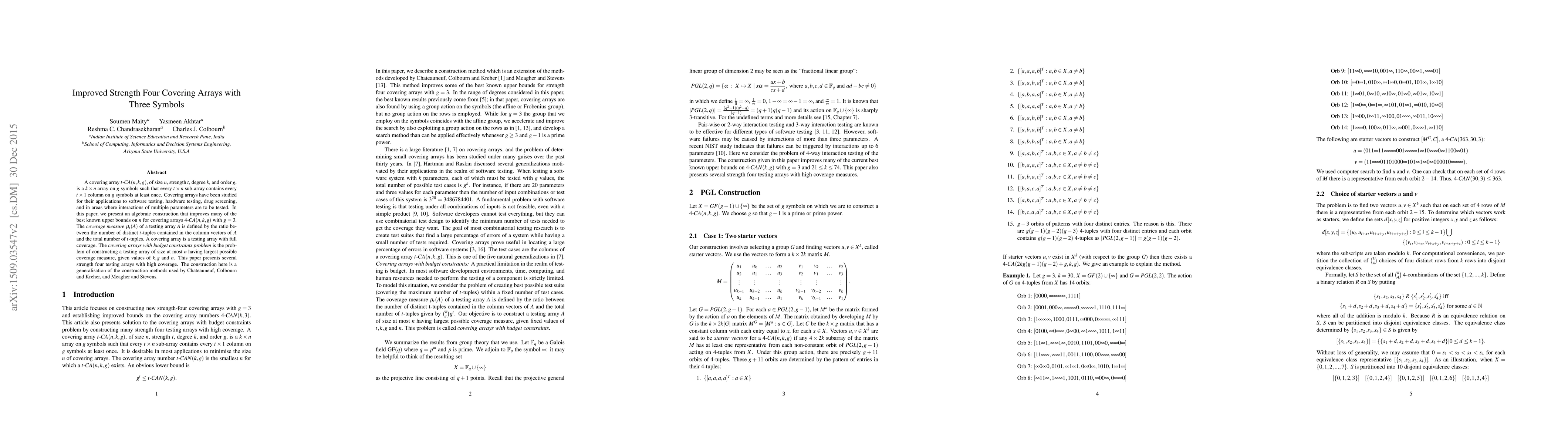 A covering array $t$-$CA(n,k,g)$, of size $n$, strength $t$, degree $k$, and order $g$, is a $k\times n$ array on $g$ symbols such that every $t\times n$ sub-array contains every $t\times 1$ column on $g$ symbols at least once. Covering arrays have been studied for their applications to software testing, hardware testing, drug screening, and in areas where interactions of multiple parameters are to be tested. In this paper, we present an algebraic construction that improves many of the best known upper bounds on $n$ for covering arrays 4-$CA(n,k,g)$ with $g=3$. The $coverage$ $measure$ $\mu_t(A)$ of a testing array $A$ is defined by the ratio between the number of distinct $t$-tuples contained in the column vectors of $A$ and the total number of $t$-tuples. A covering array is a testing array with full coverage. The $covering$ $arrays$ $with$ $budget$ $constraints$ $problem$ is the problem of constructing a testing array of size at most $n$ having largest possible coverage measure, given values of $k,g$ and $n$. This paper presents several strength four testing arrays with high coverage. The construction here is a generalisation of the construction methods used by Chateauneuf, Colbourn and Kreher, and Meagher and Stevens.