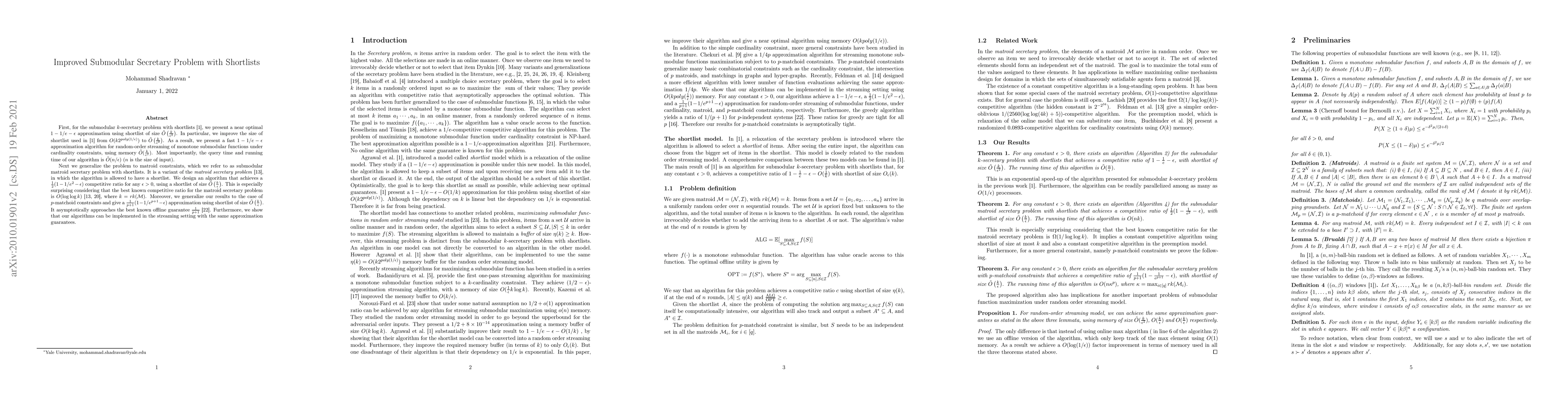 First, for the for the submodular $k$-secretary problem with shortlists [1], we provide a near optimal $1-1/e-\epsilon$ approximation using shortlist of size $O(k poly(1/\epsilon))$. In particular, we improve the size of shortlist used in \cite{us} from $O(k 2^{poly(1/\epsilon)})$ to $O(k poly(1/\epsilon))$. As a result, we provide a near optimal approximation algorithm for random-order streaming of monotone submodular functions under cardinality constraints, using memory $O(k poly(1/\epsilon))$. It exponentially improves the running time and memory of \cite{us} in terms of $1/\epsilon$. Next we generalize the problem to matroid constraints, which we refer to as submodular matroid secretary problem with shortlists. It is a variant of the \textit{matroid secretary problem} \cite{feldman2014simple}, in which the algorithm is allowed to have a shortlist. We design an algorithm that achieves a $\frac{1}{2}(1-1/e^2 -\epsilon)$ competitive ratio for any constant $\epsilon>0$, using a shortlist of size $O(k poly(\frac{1}{\epsilon}))$. Moreover, we generalize our results to the case of $p$-matchoid constraints and give a $\frac{1}{p+1}(1-1/e^{p+1}-\epsilon )$ approximation using shortlist of size $O(k poly(\frac{1}{\epsilon}))$. It asymptotically approaches the best known offline guarantee $\frac{1}{p+1}$ [22]. Furthermore, we show that our algorithms can be implemented in the streaming setting using $O(k poly(\frac{1}{\epsilon}))$ memory.