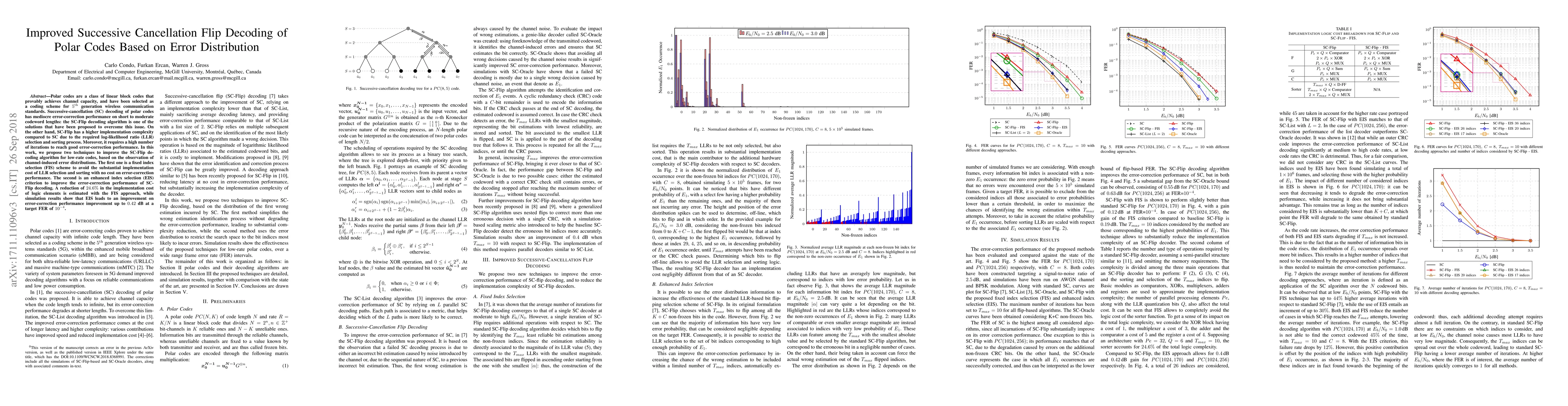 This paper proposes two techniques to improve the Successive-Cancellation Flip (SC-Flip) decoding algorithm for polar codes, aiming to enhance error-correction performance while reducing implementation complexity. The first technique, Fixed Index Selection (FIS), minimizes LLR selection costs, and the second, Enhanced Index Selection (EIS), improves error-correction performance, achieving a 24.6% reduction in logic elements and up to 0.42 dB improvement in performance.