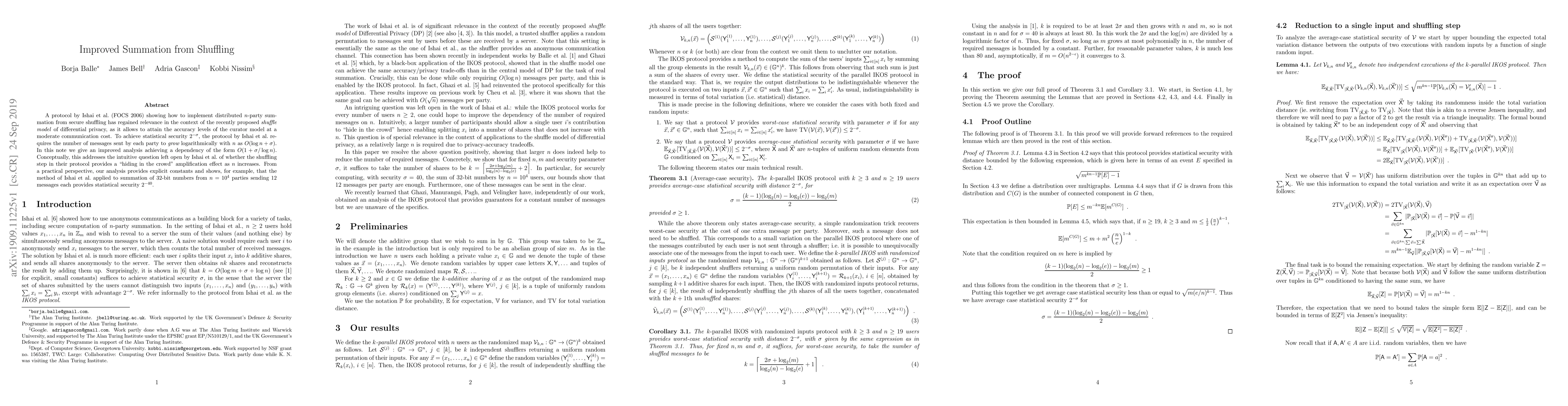 A protocol by Ishai et al.\ (FOCS 2006) showing how to implement distributed $n$-party summation from secure shuffling has regained relevance in the context of the recently proposed \emph{shuffle model} of differential privacy, as it allows to attain the accuracy levels of the curator model at a moderate communication cost. To achieve statistical security $2^{-\sigma}$, the protocol by Ishai et al.\ requires the number of messages sent by each party to {\em grow} logarithmically with $n$ as $O(\log n + \sigma)$. In this note we give an improved analysis achieving a dependency of the form $O(1+\sigma/\log n)$. Conceptually, this addresses the intuitive question left open by Ishai et al.\ of whether the shuffling step in their protocol provides a "hiding in the crowd" amplification effect as $n$ increases. From a practical perspective, our analysis provides explicit constants and shows, for example, that the method of Ishai et al.\ applied to summation of $32$-bit numbers from $n=10^4$ parties sending $12$ messages each provides statistical security $2^{-40}$.