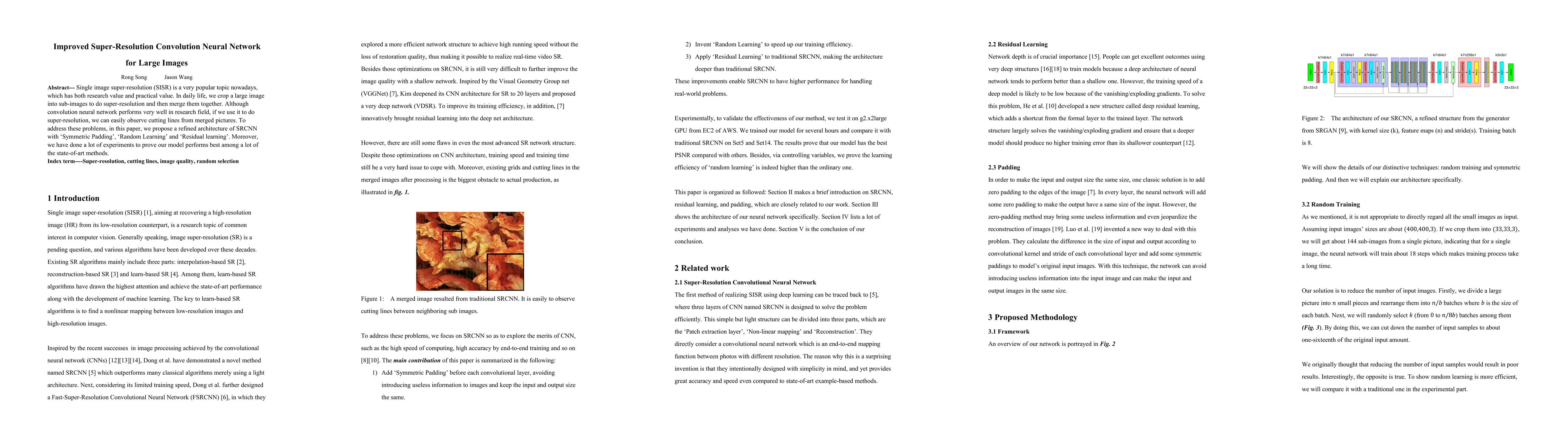 This paper introduces an improved Super-Resolution Convolutional Neural Network (SRCNN) architecture, incorporating 'Symmetric padding', 'Random learning', and 'Residual learning' to enhance large image super-resolution. Experiments demonstrate superior performance compared to existing state-of-the-art methods.