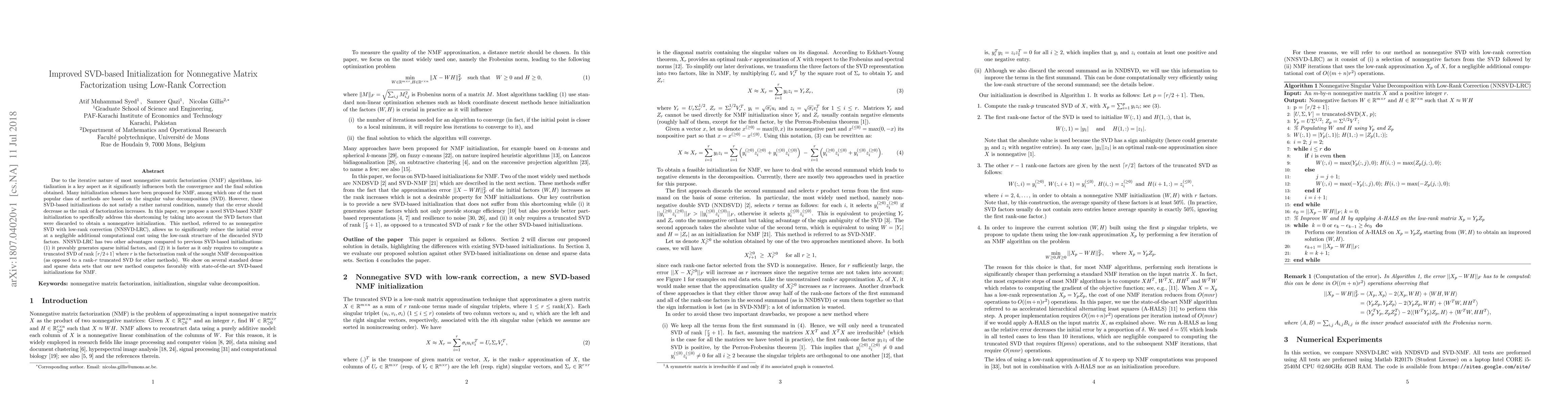 The paper proposes an improved SVD-based initialization for Nonnegative Matrix Factorization (NMF) called Nonnegative SVD with Low-Rank Correction (NNSVD-LRC). This method leverages the low-rank structure of discarded SVD factors to reduce initial error with minimal additional computational cost.