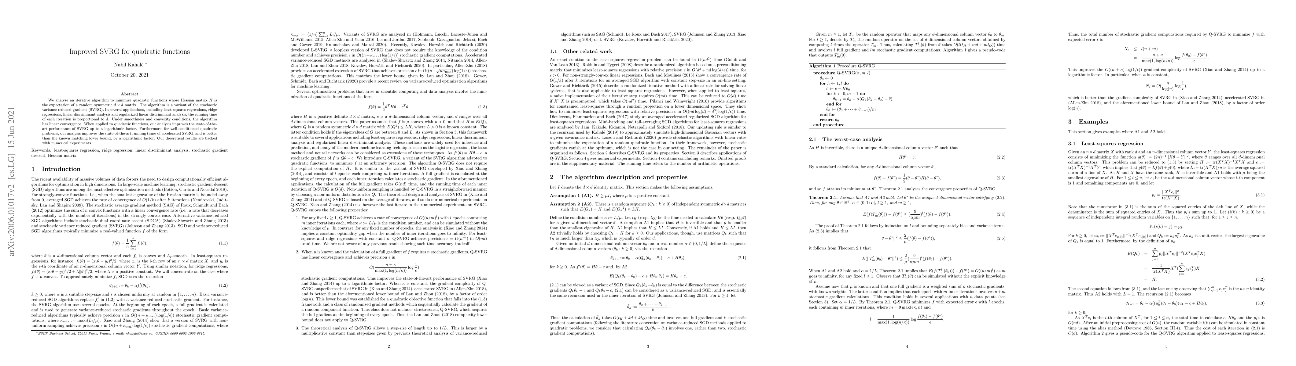 We analyse an iterative algorithm to minimize quadratic functions whose Hessian matrix $H$ is the expectation of a random symmetric $d\times d$ matrix. The algorithm is a variant of the stochastic variance reduced gradient (SVRG). In several applications, including least-squares regressions, ridge regressions, linear discriminant analysis and regularized linear discriminant analysis, the running time of each iteration is proportional to $d$. Under smoothness and convexity conditions, the algorithm has linear convergence. When applied to quadratic functions, our analysis improves the state-of-the-art performance of SVRG up to a logarithmic factor. Furthermore, for well-conditioned quadratic problems, our analysis improves the state-of-the-art running times of accelerated SVRG, and is better than the known matching lower bound, by a logarithmic factor. Our theoretical results are backed with numerical experiments.