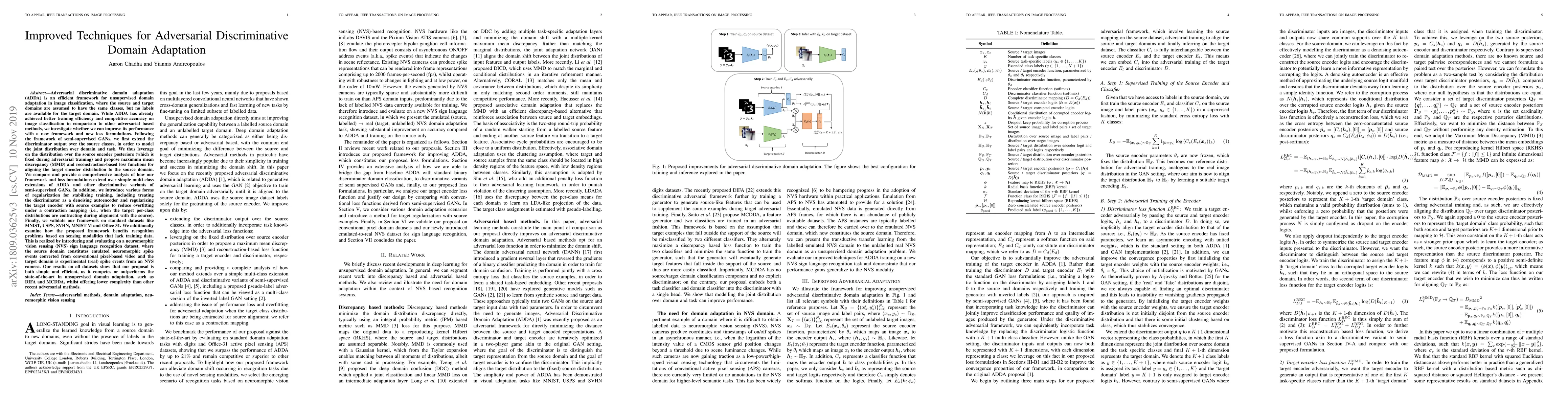 This paper proposes an improved framework for adversarial discriminative domain adaptation (ADDA) using new loss formulations and regularization techniques. The authors extend the discriminator to model the joint distribution over domain and task, and introduce maximum mean discrepancy and reconstruction-based losses for better domain alignment. Their approach outperforms state-of-the-art methods on standard datasets and novel neuromorphic vision sensing sign language recognition tasks.
