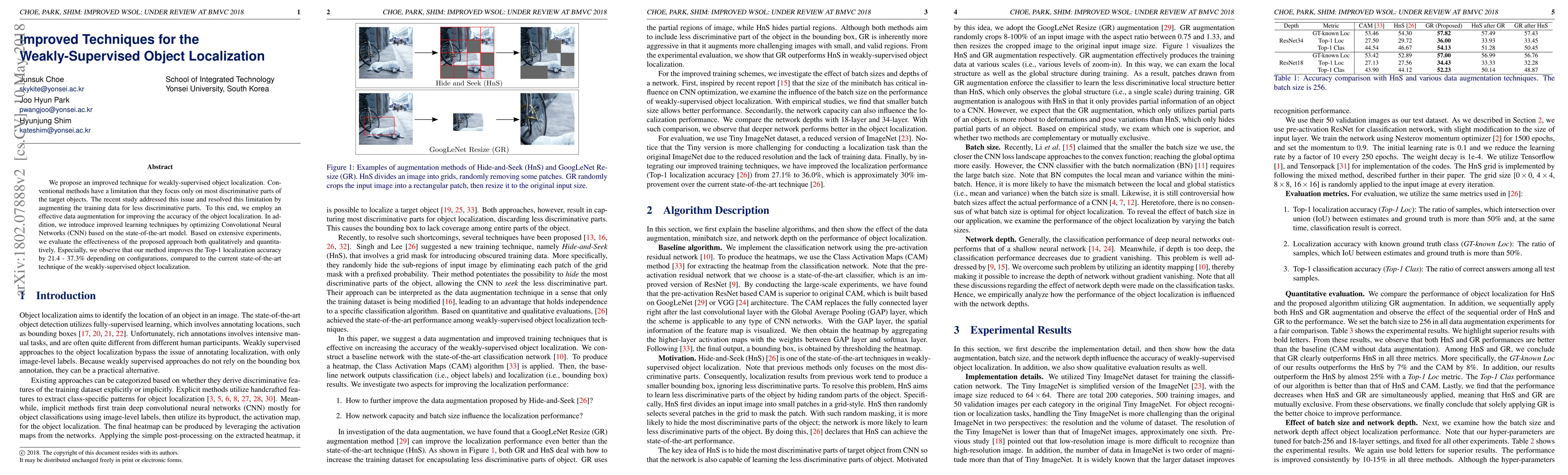 This paper proposes an enhanced technique for weakly-supervised object localization, addressing the limitation of focusing only on the most discriminative parts by using data augmentation for less discriminative regions. The method optimizes Convolutional Neural Networks (CNN) to improve localization accuracy, achieving a significant improvement in Top-1 localization accuracy by 21.4 - 37.3% over existing methods.