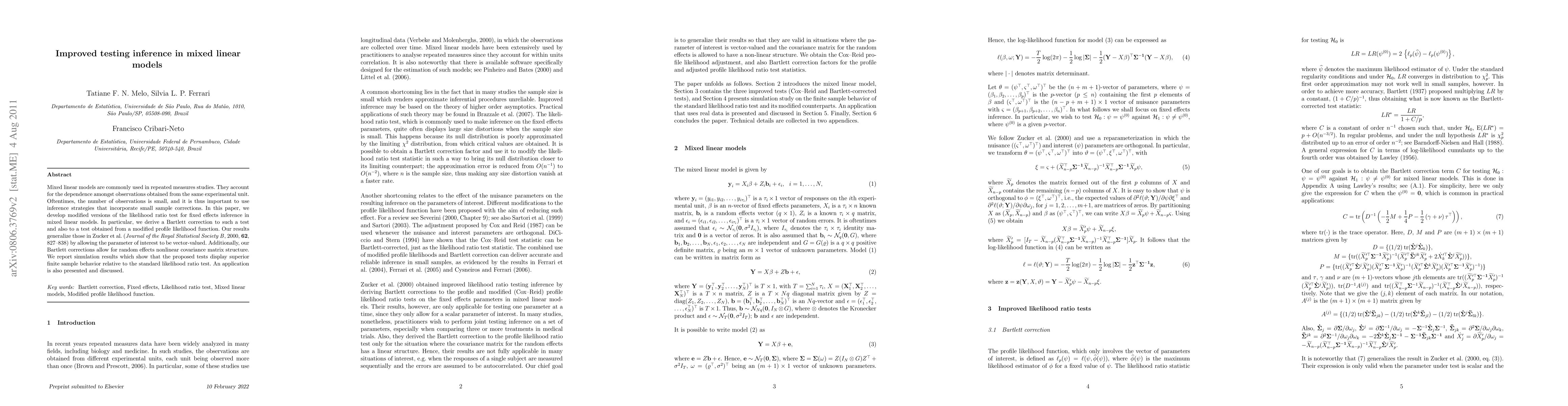 This paper develops improved inference methods for fixed effects in mixed linear models, introducing Bartlett corrections to likelihood ratio tests. The proposed tests show superior performance in small sample sizes, extending previous work by accommodating vector-valued parameters and nonlinear random effects covariance structures.