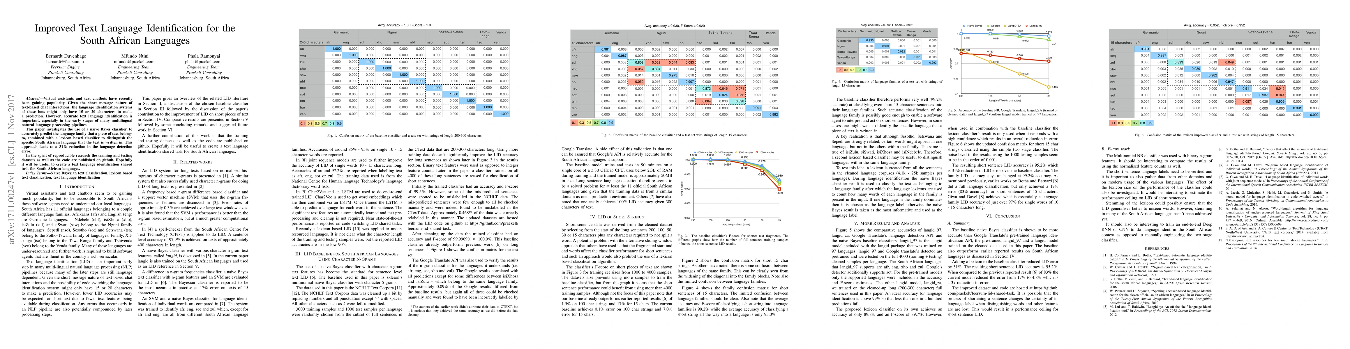 This paper proposes an improved text language identification method for South African languages using a naive Bayes classifier and a lexicon-based classifier, achieving a 31% reduction in error. The datasets and code are openly available to facilitate further research and shared tasks.