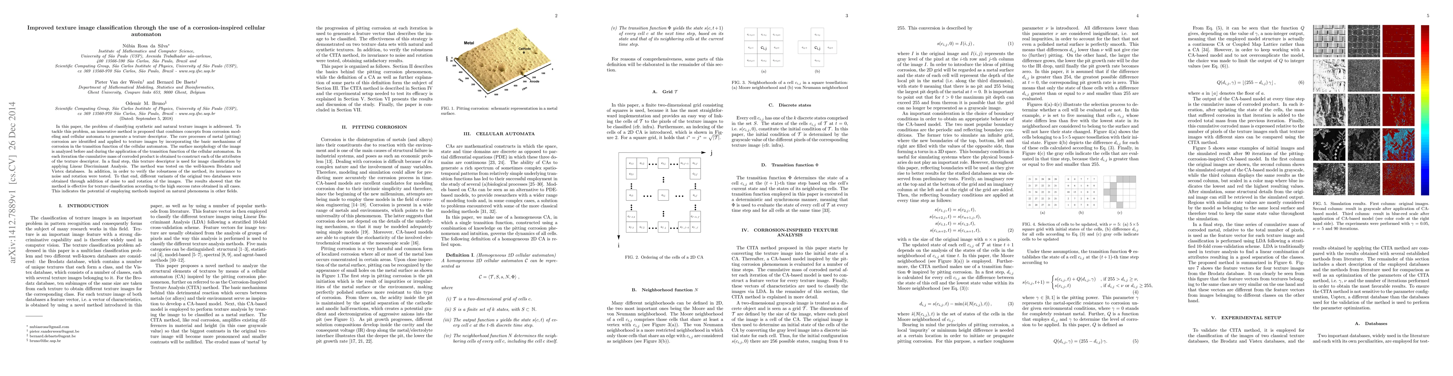 In this paper, the problem of classifying synthetic and natural texture images is addressed. To tackle this problem, an innovative method is proposed that combines concepts from corrosion modeling and cellular automata to generate a texture descriptor. The core processes of metal (pitting) corrosion are identified and applied to texture images by incorporating the basic mechanisms of corrosion in the transition function of the cellular automaton. The surface morphology of the image is analyzed before and during the application of the transition function of the cellular automaton. In each iteration the cumulative mass of corroded product is obtained to construct each of the attributes of the texture descriptor. In a final step, this texture descriptor is used for image classification by applying Linear Discriminant Analysis. The method was tested on the well-known Brodatz and Vistex databases. In addition, in order to verify the robustness of the method, its invariance to noise and rotation were tested. To that end, different variants of the original two databases were obtained through addition of noise to and rotation of the images. The results showed that the method is effective for texture classification according to the high success rates obtained in all cases. This indicates the potential of employing methods inspired on natural phenomena in other fields.