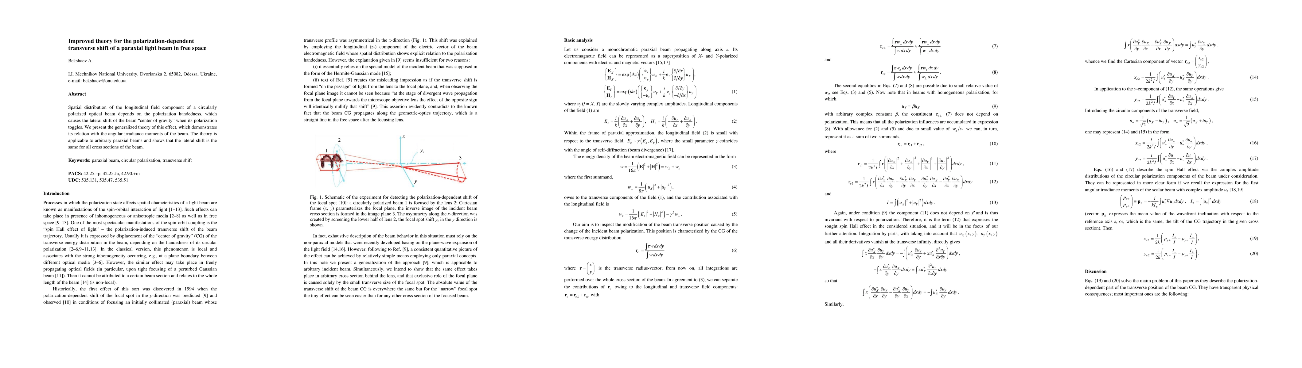This paper presents a generalized theory explaining the polarization-dependent transverse shift of paraxial light beams in free space, linking the shift to the angular irradiance moments and demonstrating its consistency across all beam cross sections. The theory applies to any paraxial beam and elucidates the effect's dependence on the polarization handedness.