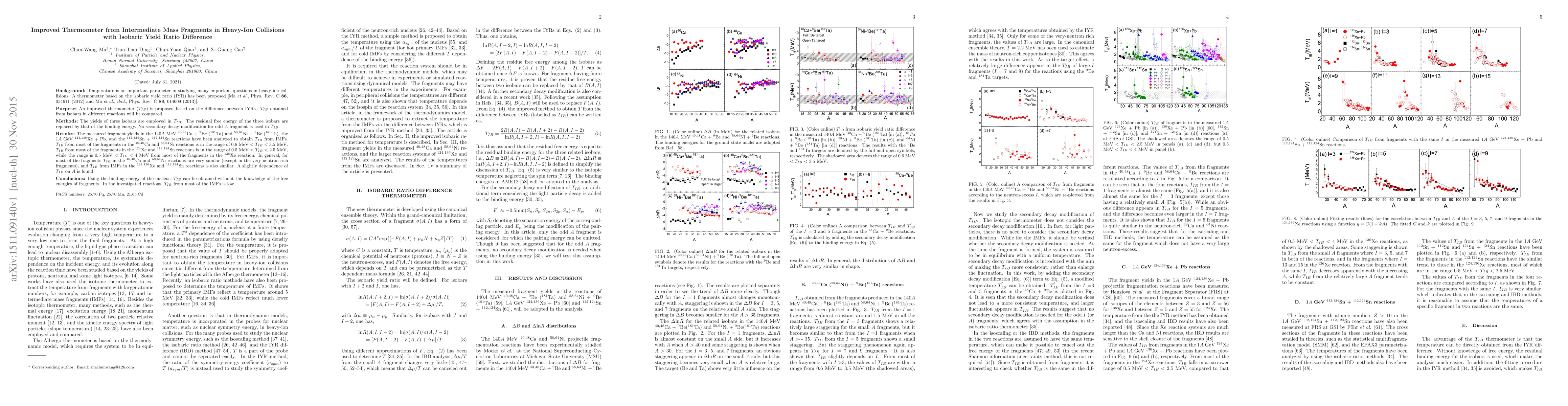 \item[Background] Temperature is an important parameter in studying many important questions in heavy-ion collisions. A thermometer based on the isobaric yield ratio (IYR) has been proposed [Ma \textit{et al.}, Phys. Rev. C \textbf{86}, 054611 (2012) and Ma \textit{et al.}, \textit{ibid.}, Phys. Rev. C \textbf{88}, 014609 (2013)]. \item[Purpose] An improved thermometer ($T_{IB}$) is proposed based on the difference between IYRs. $T_{IB}$ obtained from isobars in different reactions will be compared. \item[Methods] The yields of three isobars are employed in $T_{IB}$. The residual free energy of the three isobars are replaced by that of the binding energy. No secondary decay modification for odd $A$ fragment is used in $T_{IB}$. \item[Results] The measured fragment yields in the 140$A$ MeV $^{40, 48}$Ca + $^{9}$Be ($^{181}$Ta) and $^{58, 64}$Ni + $^9$Be ($^{181}$Ta), the 1$A$ GeV $^{124, 136}$Xe + Pb, and the $^{112,124}$Sn + $^{112,124}$Sn reactions have been analyzed to obtain $T_{IB}$ from IMFs. $T_{IB}$ from most of the fragments in the $^{40, 48}$Ca and $^{58, 64}$Ni reactions is in the range of 0.6 MeV $ < T_{IB} < $ 3.5 MeV. $T_{IB}$ from most of the fragments in the $^{124}$Xe and $^{112,124}$Sn reactions is in the range of 0.5 MeV $ < T_{IB} < $ 2.5 MeV, while the range is 0.5 MeV $ < T_{IB} <$ 4 MeV from most of the fragments in the $^{136}$Xe reaction. In general, for most of the fragments $T_{IB}$ in the $^{40, 48}$Ca and $^{58, 64}$Ni reactions are very similar (except in the very neutron-rich fragments), and $T_{IB}$ from IMFs in the $^{124, 136}$Xe and $^{112,124}$Sn reactions is also similar. A slightly dependence of $T_{IB}$ on $A$ is found. \item[Conclusions] Using the binding energy of the nucleus, $T_{IB}$ can be obtained without the knowledge of the free energies of fragments. In the investigated reactions, $T_{IB}$ from most of the IMFs is low.