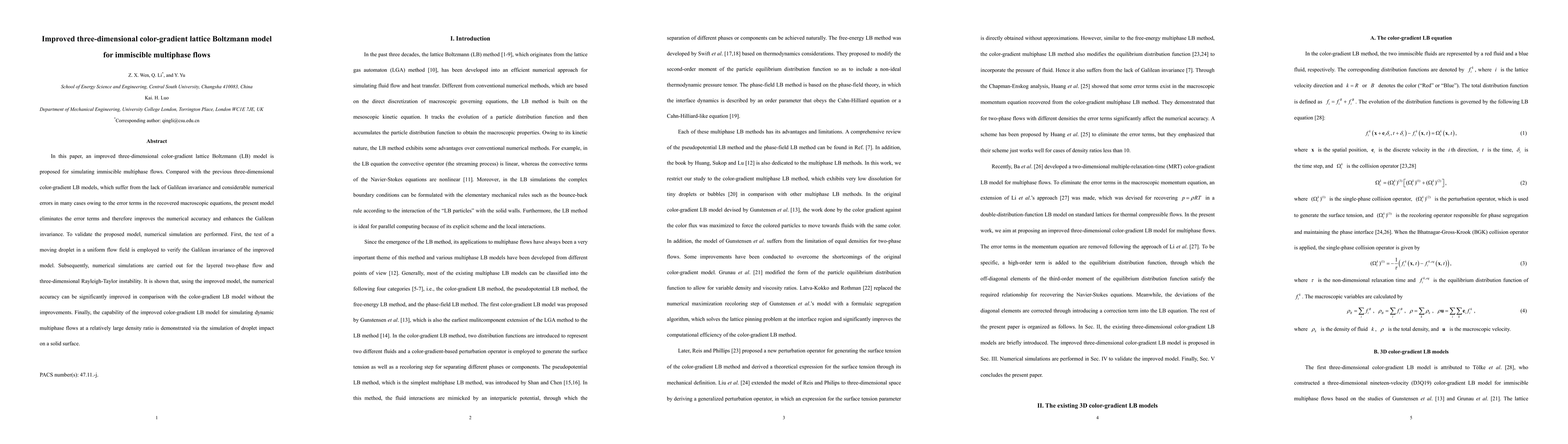 The paper introduces an improved three-dimensional color-gradient LB model that corrects error terms, enhancing Galilean invariance and numerical accuracy.