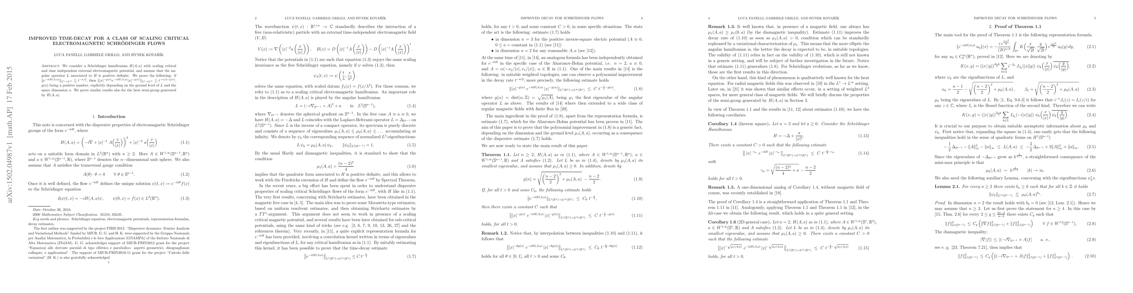 We consider a Schr\"odinger hamiltonian $H(A,a)$ with scaling critical and time independent external electromagnetic potential, and assume that the angular operator $L$ associated to $H$ is positive definite. We prove the following: if $\|e^{-itH(A,a)}\|_{L^1\to L^\infty}\lesssim t^{-n/2}$, then $ \||x|^{-g(n)}e^{-itH(A,a)}|x|^{-g(n)}\|_{L^1\to L^\infty}\lesssim t^{-n/2-g(n)}$, $g(n)$ being a positive number, explicitly depending on the ground level of $L$ and the space dimension $n$. We prove similar results also for the heat semi-group generated by $H(A,a)$.