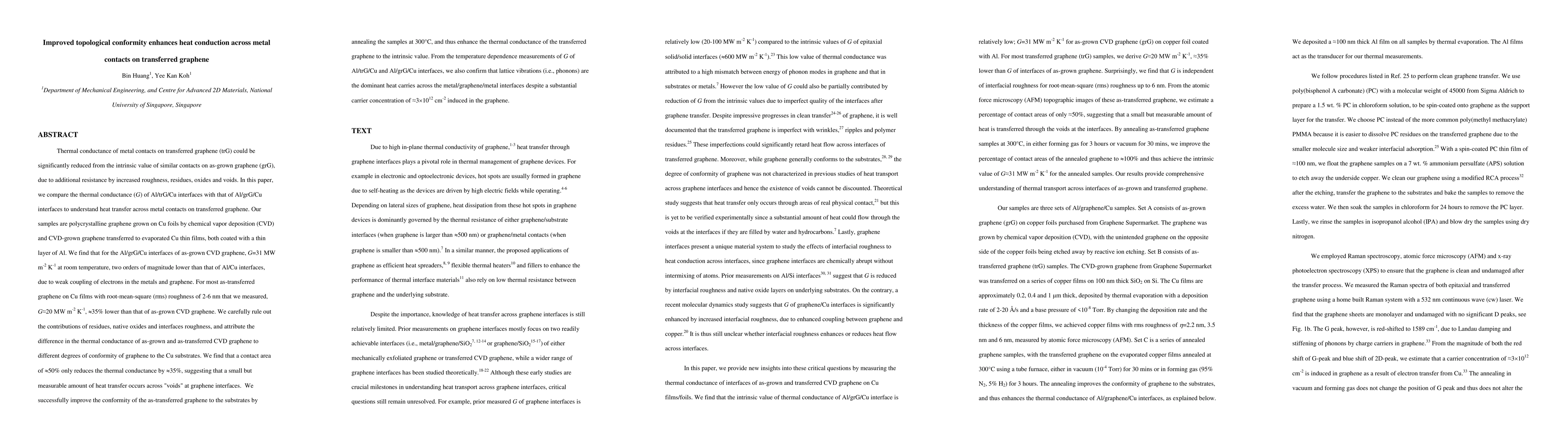This paper investigates thermal conductance across metal contacts on transferred graphene (trG) compared to as-grown graphene (grG), finding that transferred graphene exhibits lower thermal conductance due to reduced conformity to Cu substrates. Improved thermal conductance is achieved by annealing, which enhances graphene conformity.