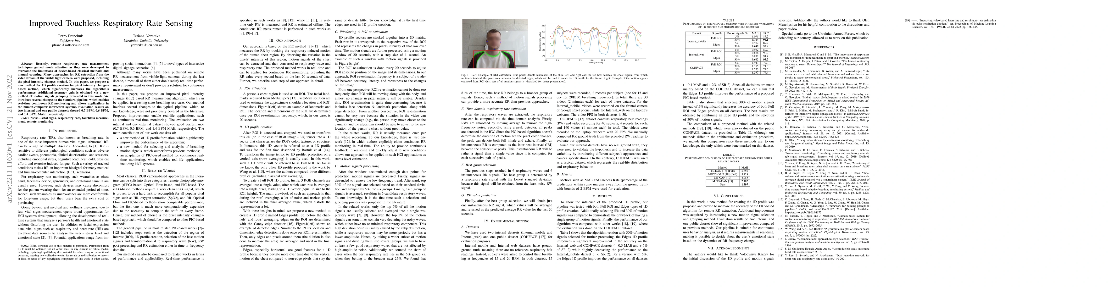 This paper proposes an enhanced touchless method for respiratory rate measurement using visible light cameras, focusing on improving the 1D profile creation for pixel intensity changes and introducing a new motion signal grouping technique. Evaluations demonstrate improved accuracy with MAE values of 0.7, 0.6, and 1.4 BPM on different datasets.