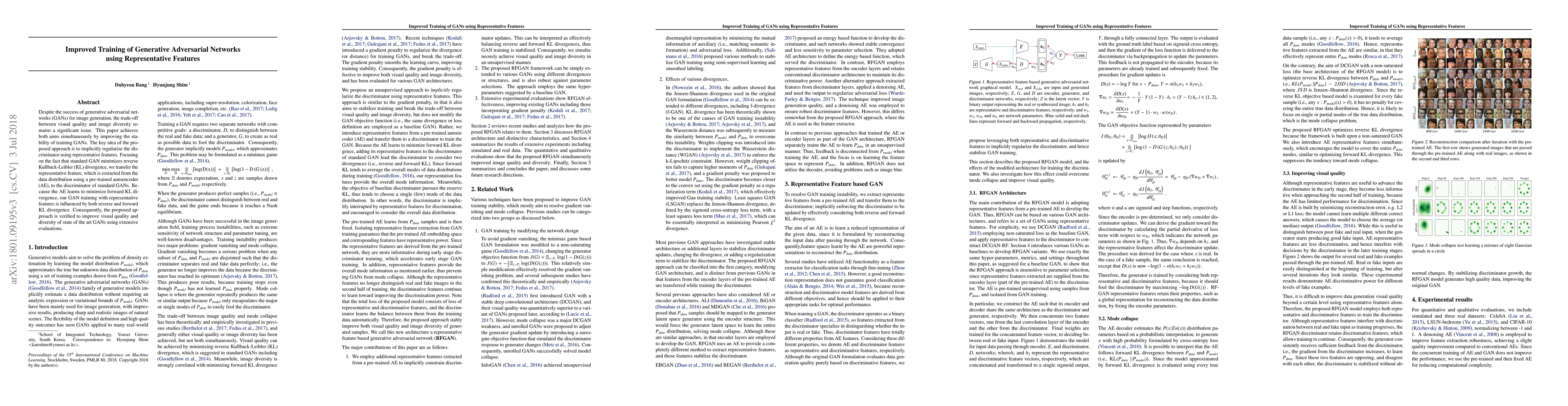 This paper proposes a method to enhance the training stability of generative adversarial networks (GANs) by incorporating representative features, extracted via a pre-trained autoencoder, into the discriminator. This dual influence of reverse and forward KL divergence improves both the visual quality and diversity of generated images.