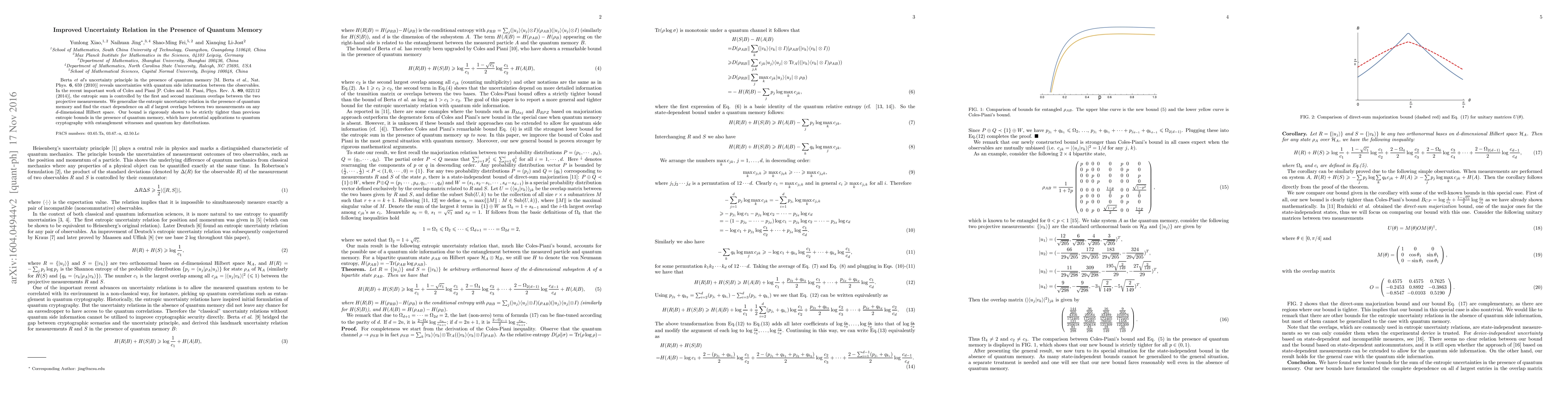This paper generalizes the entropic uncertainty relation to include quantum memory, deriving tighter bounds based on the $d$ largest overlaps between measurements. These improved relations have potential applications in quantum cryptography, particularly in quantum key distribution.