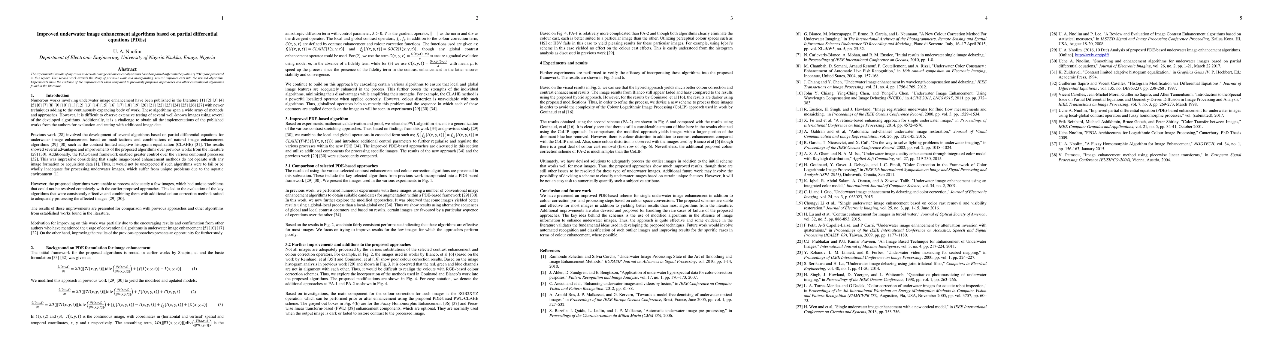 The experimental results of improved underwater image enhancement algorithms based on partial differential equations (PDEs) are presented in this report. This second work extends the study of previous work and incorporating several improvements into the revised algorithm. Experiments show the evidence of the improvements when compared to previously proposed approaches and other conventional algorithms found in the literature.