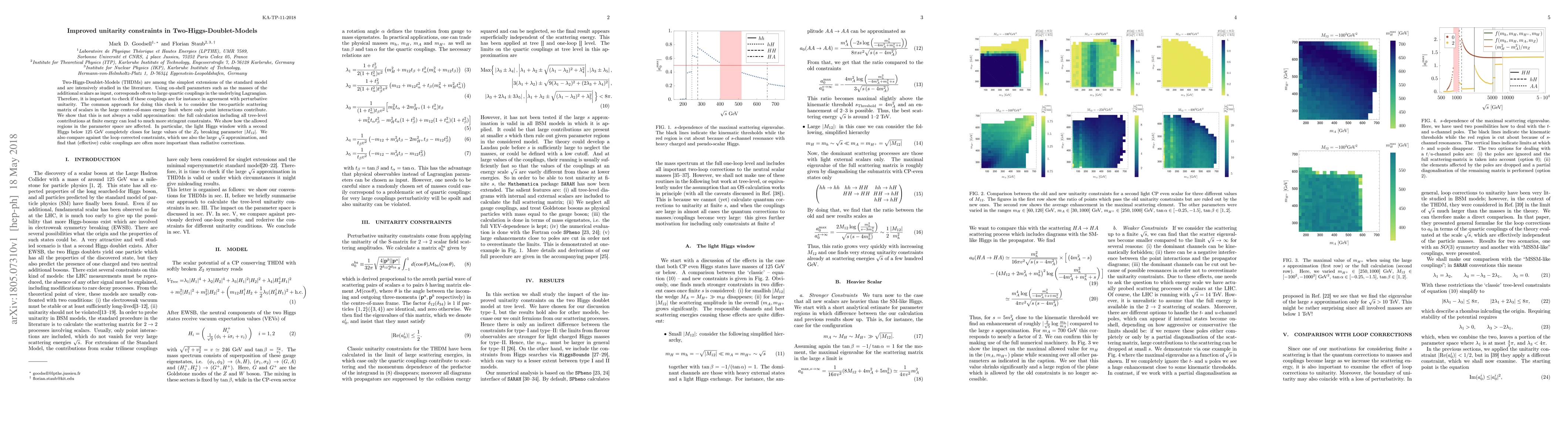 Two-Higgs-Doublet-Models (THDMs) are among the simplest extensions of the standard model and are intensively studied in the literature. Using on-shell parameters such as the masses of the additional scalars as input, corresponds often to large quartic couplings in the underlying Lagrangian. Therefore, it is important to check if these couplings are for instance in agreement with perturbative unitarity. The common approach for doing this check is to consider the two-particle scattering matrix of scalars in the large centre-of-mass energy limit where only point interactions contribute. We show that this is not always a valid approximation: the full calculation including all tree-level contributions at finite energy can lead to much more stringent constraints. We show how the allowed regions in the parameter space are affected. In particular, the light Higgs window with a second Higgs below 125 GeV completely closes for large values of the $Z_2$ breaking parameter $|M_{12}|$. We also compare against the loop corrected constraints, which use also the large $\sqrt{s}$ approximation, and find that (effective) cubic couplings are often more important than radiative corrections.