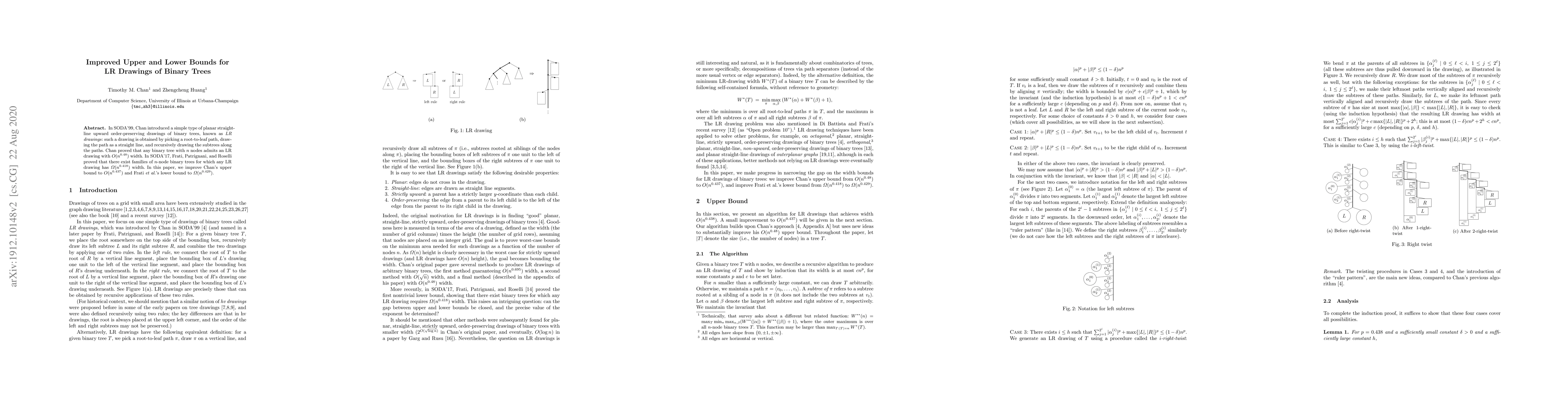 In SODA'99, Chan introduced a simple type of planar straight-line upward order-preserving drawings of binary trees, known as LR drawings: such a drawing is obtained by picking a root-to-leaf path, drawing the path as a straight line, and recursively drawing the subtrees along the paths. Chan proved that any binary tree with $n$ nodes admits an LR drawing with $O(n^{0.48})$ width. In SODA'17, Frati, Patrignani, and Roselli proved that there exist families of $n$-node binary trees for which any LR drawing has $\Omega(n^{0.418})$ width. In this note, we improve Chan's upper bound to $O(n^{0.437})$ and Frati et al.'s lower bound to $\Omega(n^{0.429})$.