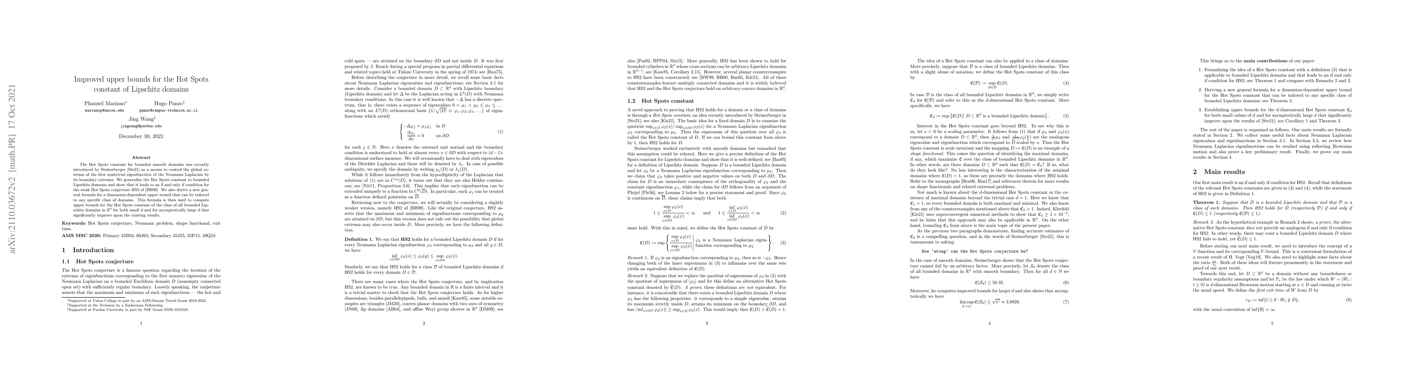 The Hot Spots constant for bounded smooth domains was recently introduced by Steinerberger (2021) as a means to control the global extrema of the first nontrivial eigenfunction of the Neumann Laplacian by its boundary extrema. We generalize the Hot Spots constant to bounded Lipschitz domains and show that it leads to an if and only if condition for the weak Hot Spots conjecture HS2 from Ba\~{n}uelos and Burdzy (1999). We also derive a new general formula for a dimension-dependent upper bound that can be tailored to any specific class of domains. This formula is then used to compute upper bounds for the Hot Spots constant of the class of all bounded Lipschitz domains in $\mathbb{R}^d$ for both small $d$ and for asymptotically large $d$ that significantly improve upon the existing results.