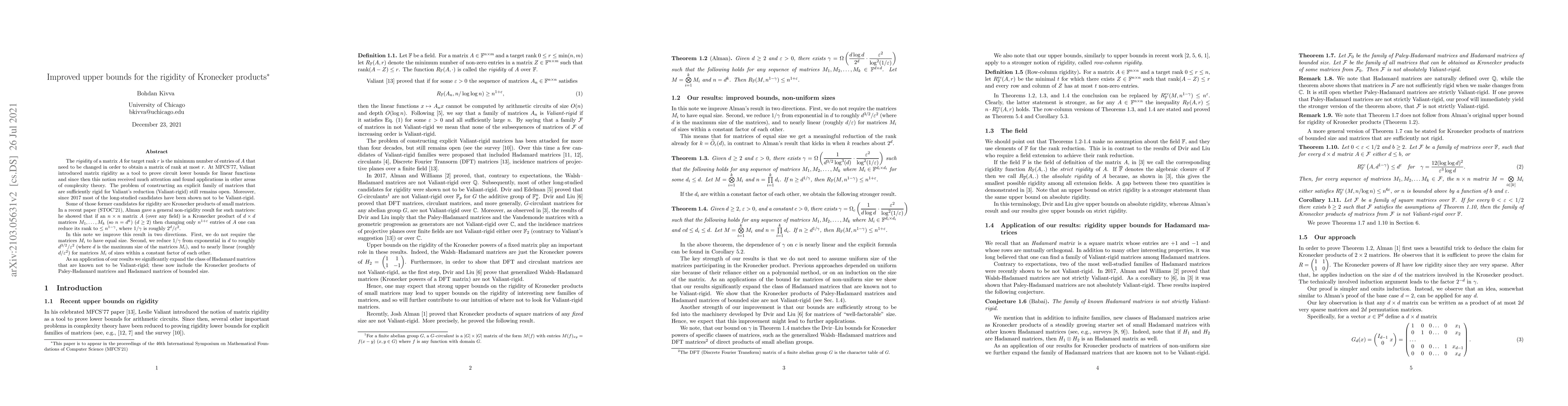 This paper improves upper bounds on the rigidity of Kronecker products, showing that fewer entries need to be changed to reduce their rank compared to previous results. The authors achieve this by allowing matrices of different sizes and reducing the exponential dependence on the matrix size to a more manageable form.