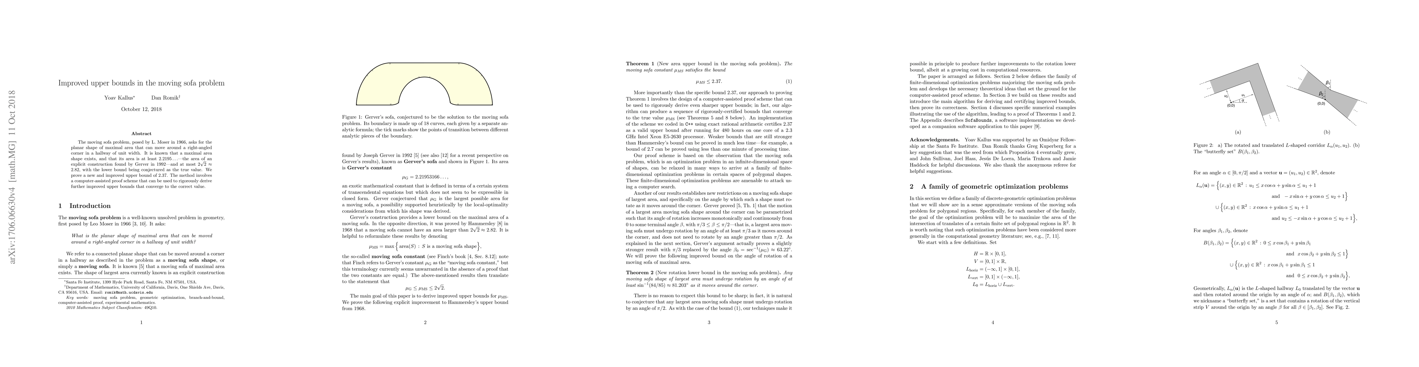 The moving sofa problem, posed by L. Moser in 1966, asks for the planar shape of maximal area that can move around a right-angled corner in a hallway of unit width. It is known that a maximal area shape exists, and that its area is at least 2.2195... - the area of an explicit construction found by Gerver in 1992 - and at most $2\sqrt{2}=2.82...$, with the lower bound being conjectured as the true value. We prove a new and improved upper bound of 2.37. The method involves a computer-assisted proof scheme that can be used to rigorously derive further improved upper bounds that converge to the correct value.