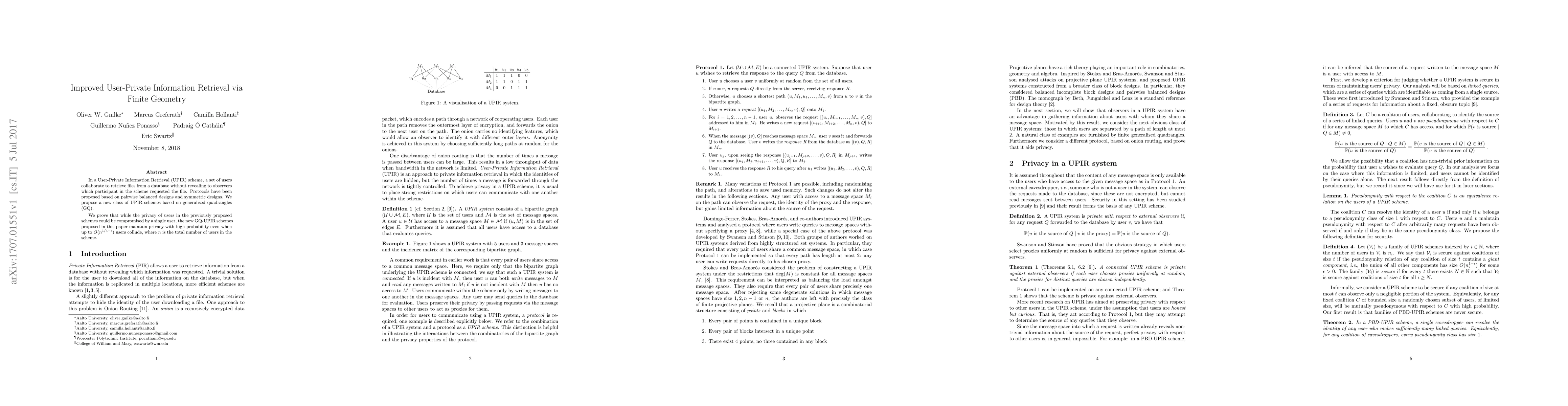 In a User-Private Information Retrieval (UPIR) scheme, a set of users collaborate to retrieve files from a database without revealing to observers which participant in the scheme requested the file. Protocols have been proposed based on pairwise balanced designs and symmetric designs. Wepropose a new class of UPIR schemes based on generalised quadrangles (GQ). We prove that while the privacy of users in the previously proposed schemes could be compromised by a single user, the new GQ-UPIR schemes proposed in this paper maintain privacy with high probability even when up to $O(n^{1/4 - \epsilon})$ users collude, where $n$ is the total number of users in the scheme.