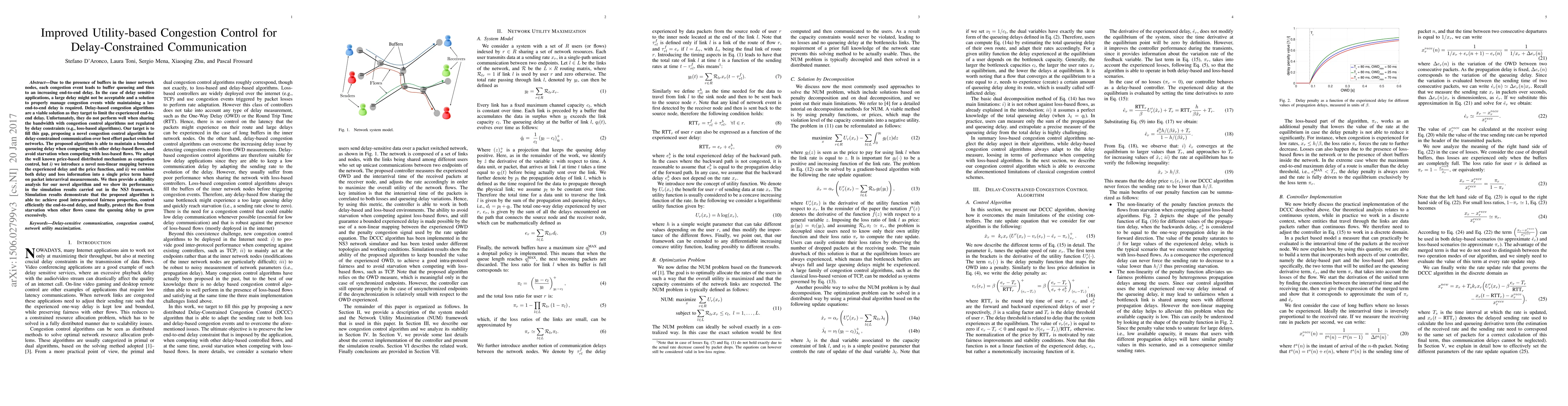 This paper proposes a novel congestion control algorithm for delay-constrained communication that combines delay and loss information into a single price term. The algorithm maintains bounded queueing delay and avoids starvation when competing with loss-based flows, demonstrating good intra-protocol fairness and effective delay control in NS3 simulations.