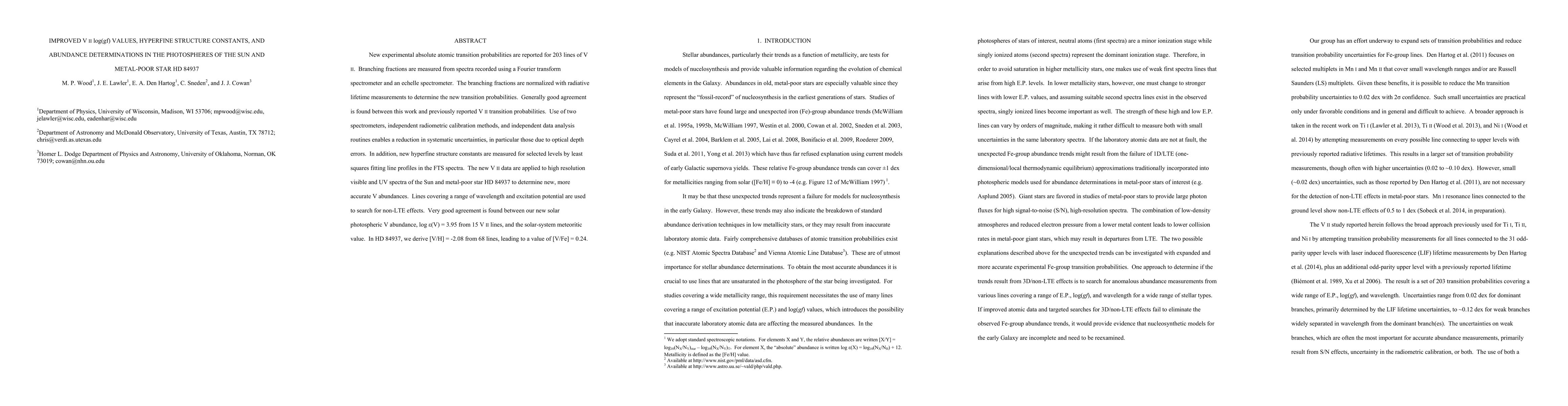 New experimental absolute atomic transition probabilities are reported for 203 lines of V II. Branching fractions are measured from spectra recorded using a Fourier transform spectrometer and an echelle spectrometer. The branching fractions are normalized with radiative lifetime measurements to determine the new transition probabilities. Generally good agreement is found between this work and previously reported V II transition probabilities. Use of two spectrometers, independent radiometric calibration methods, and independent data analysis routines enables a reduction in systematic uncertainties, in particular those due to optical depth errors. In addition, new hyperfine structure constants are measured for selected levels by least squares fitting line profiles in the FTS spectra. The new V II data are applied to high resolution visible and UV spectra of the Sun and metal-poor star HD 84937 to determine new, more accurate V abundances. Lines covering a range of wavelength and excitation potential are used to search for non-LTE effects. Very good agreement is found between our new solar photospheric V abundance, log {\epsilon}(V) = 3.95 from 15 V II lines, and the solar-system meteoritic value. In HD 84937, we derive [V/H] = -2.08 from 68 lines, leading to a value of [V/Fe] = 0.24.