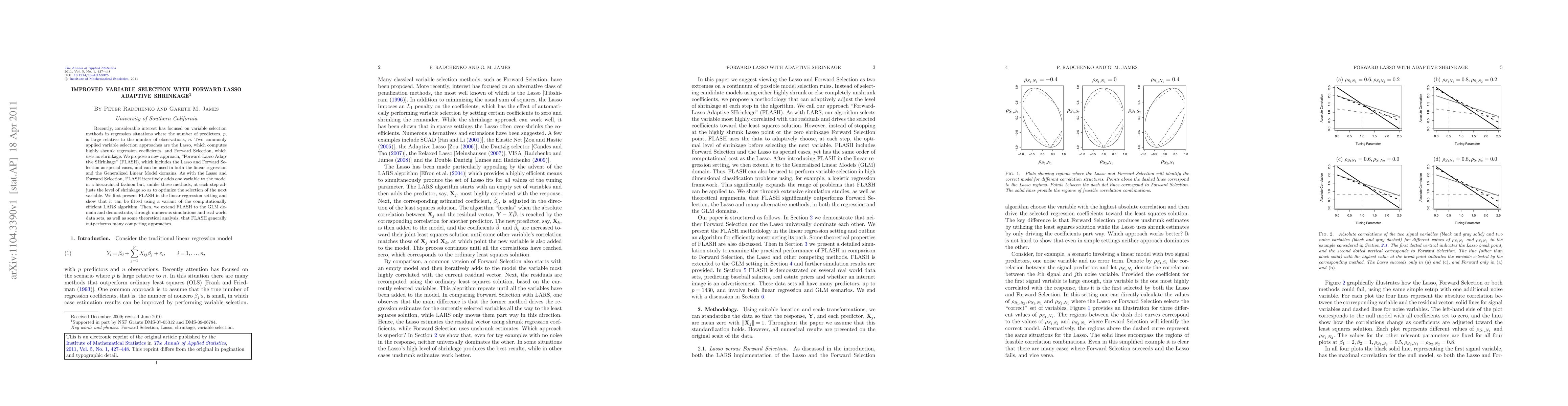 The paper introduces FLASH, a new adaptive shrinkage method combining Lasso and Forward Selection for variable selection in high-dimensional regression. FLASH optimizes the level of shrinkage at each step to improve variable selection, outperforming other methods in both linear regression and Generalized Linear Models.