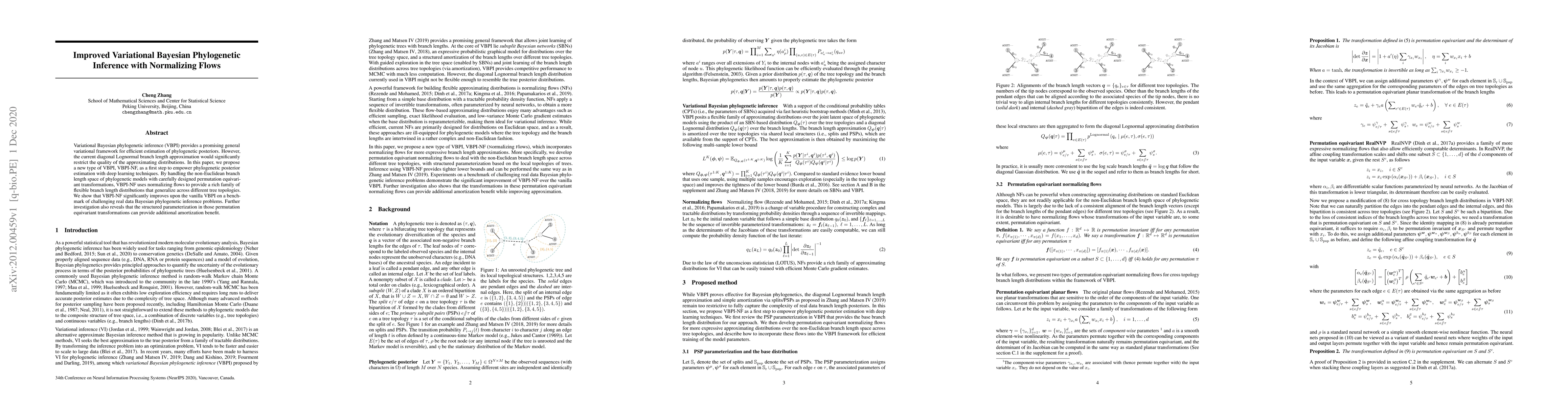 This paper introduces VBPI-NF, an enhanced variational Bayesian phylogenetic inference method using normalizing flows to improve branch length distribution flexibility. It demonstrates significant improvements over traditional VBPI on complex real-world data, with added benefits from permutation equivariant transformations.