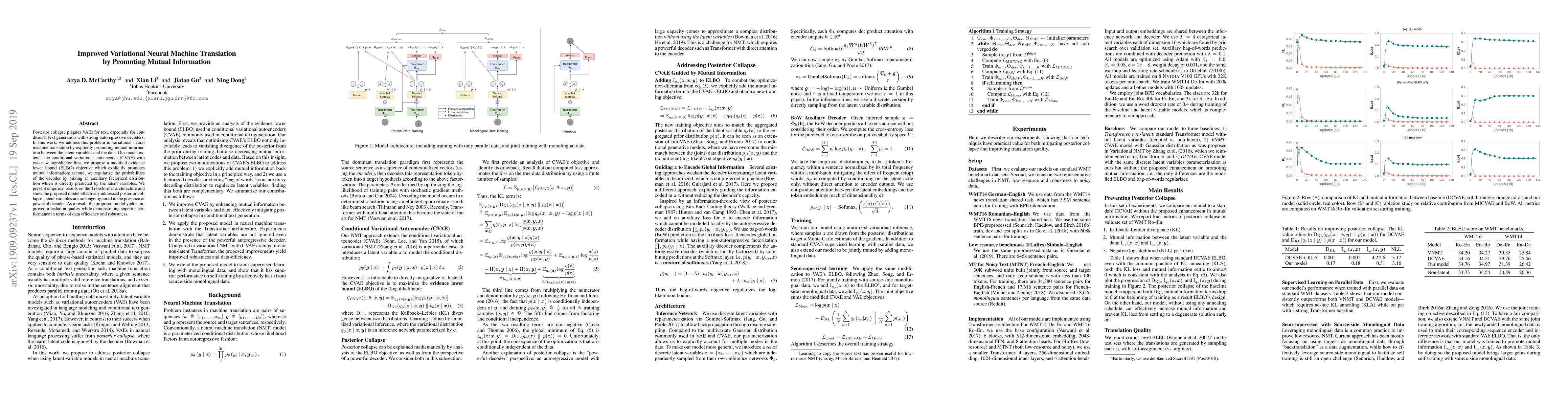 This paper proposes a method to tackle posterior collapse in variational neural machine translation by enhancing mutual information between latent variables and data. The model modifies the ELBO objective and introduces a regularized decoder, leading to improved translation quality, data efficiency, and robustness.