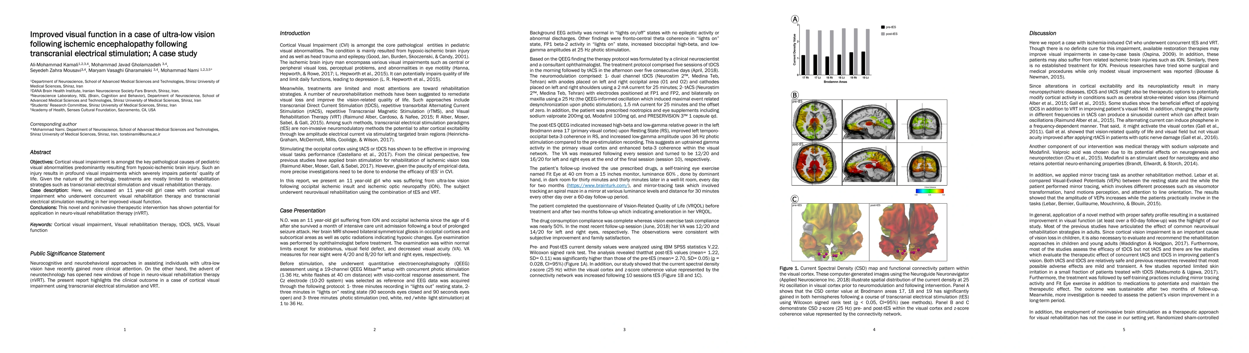 Cortical visual impairment is amongst the key pathological causes of pediatric visual abnormalities predominantly resulting from hypoxic-ischemic brain injury. Such an injury results in profound visual impairments which severely impairs the patient's quality of life. Given the nature of the pathology, treatments are mostly limited to rehabilitation strategies such as transcranial electrical stimulation and visual rehabilitation therapy. Here, we discussed an 11 year-old girl case with cortical visual impairment who underwent concurrent visual rehabilitation therapy and transcranial electrical stimulation resulting in her improved visual function. This novel and noninvasive therapeutic intervention has shown potential for application in neuro-visual rehabilitation therapy (nVRT).