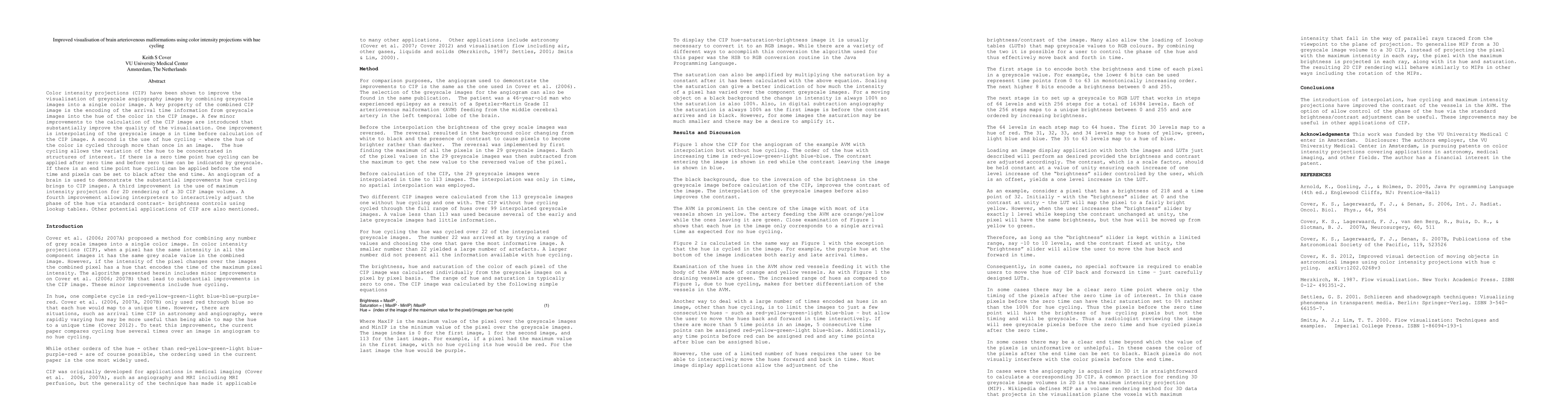 Researchers improved brain arteriovenous malformation visualization using color intensity projections with hue cycling, enhancing image quality and allowing for interactive adjustment of hues.