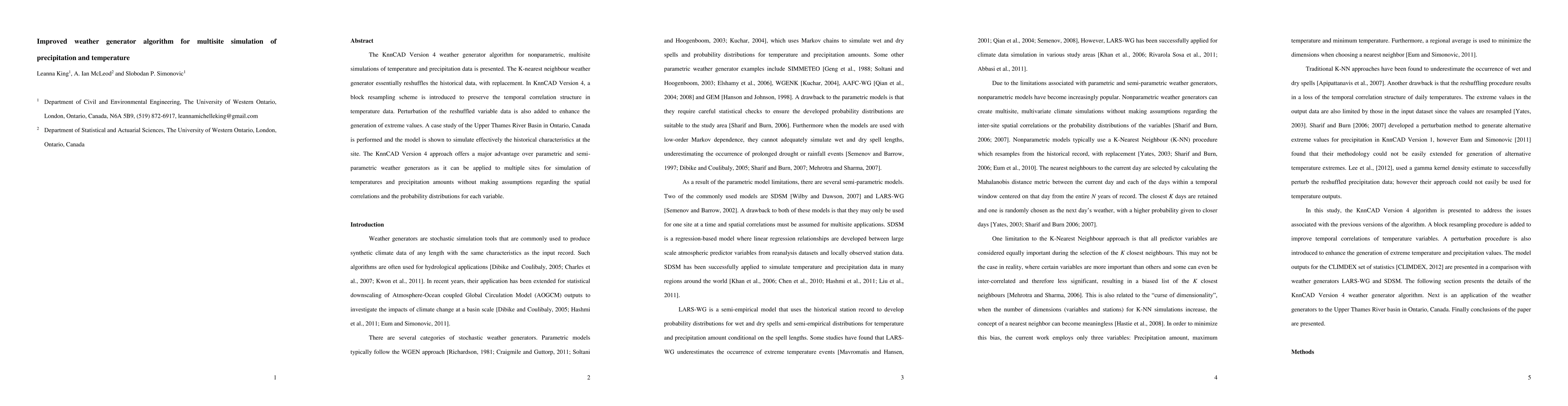 The KnnCAD Version 4 weather generator algorithm for nonparametric, multisite simulations of temperature and precipitation data is presented. The K-nearest neighbour weather generator essentially reshuffles the historical data, with replacement. In KnnCAD Version 4, a block resampling scheme is introduced to preserve the temporal correlation structure in temperature data. Perturbation of the reshuffled variable data is also added to enhance the generation of extreme values. A case study of the Upper Thames River Basin in Ontario, Canada is performed and the model is shown to simulate effectively the historical characteristics at the site. The KnnCAD Version 4 approach offers a major advantage over parametric and semi-parametric weather generators as it can be applied to multiple sites for simulation of temperatures and precipitation amounts without making assumptions regarding the spatial correlations and the probability distributions for each variable.